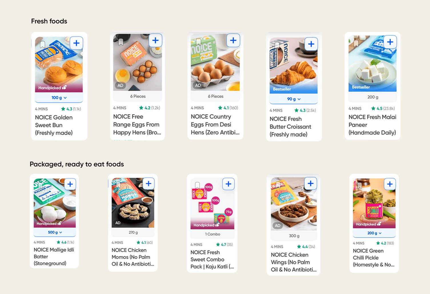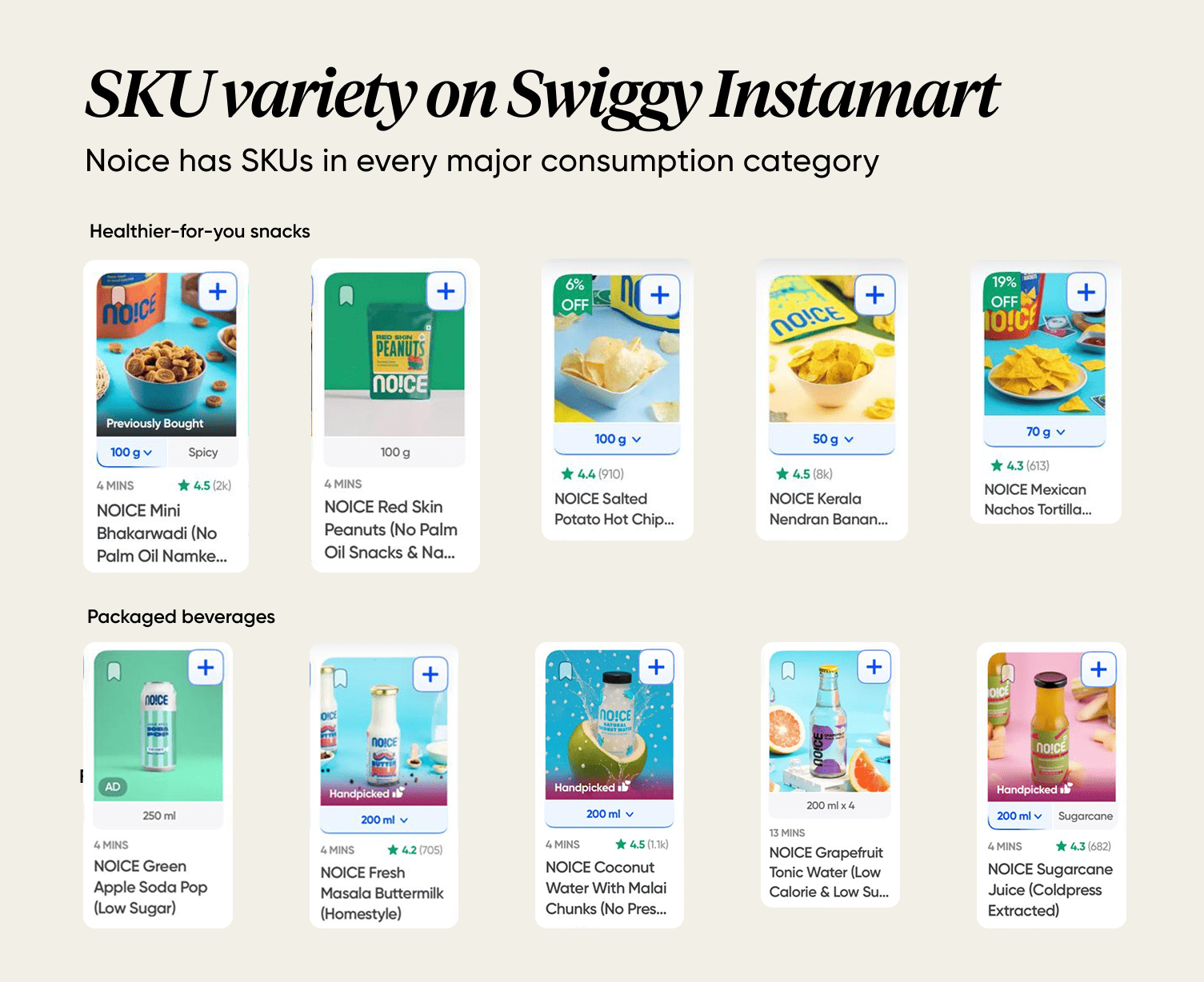 Search for homemade chips or kombucha, you will mostly find Noice as the first few options on Instamart. Noice is present in 40+ product categories.