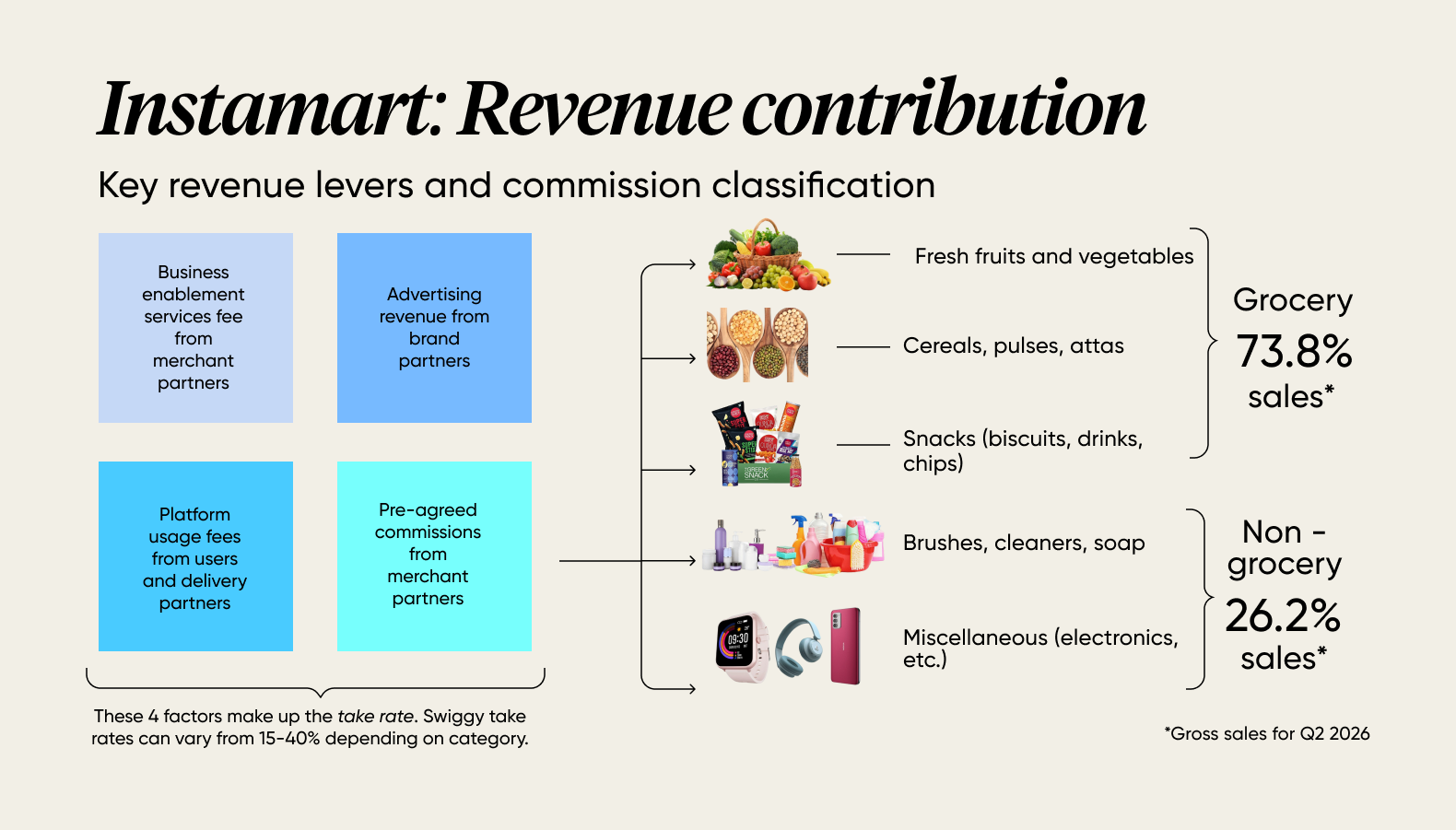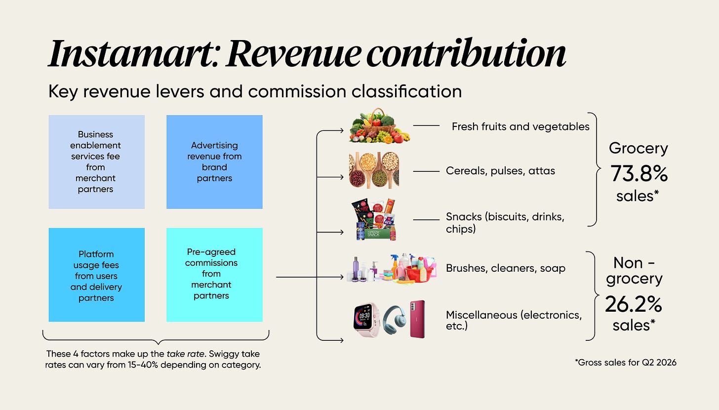 Swiggy earns a small fraction of every order placed on the platform. This is the take rate. So, for example, when you buy items worth ₹1,000, they broadly make 7% to 12% based on what you ordered. Groceries, especially fresh groceries, have a lower take rate (lower commissions). Electronics? Higher order value & higher take rate (higher absolute margin ₹).