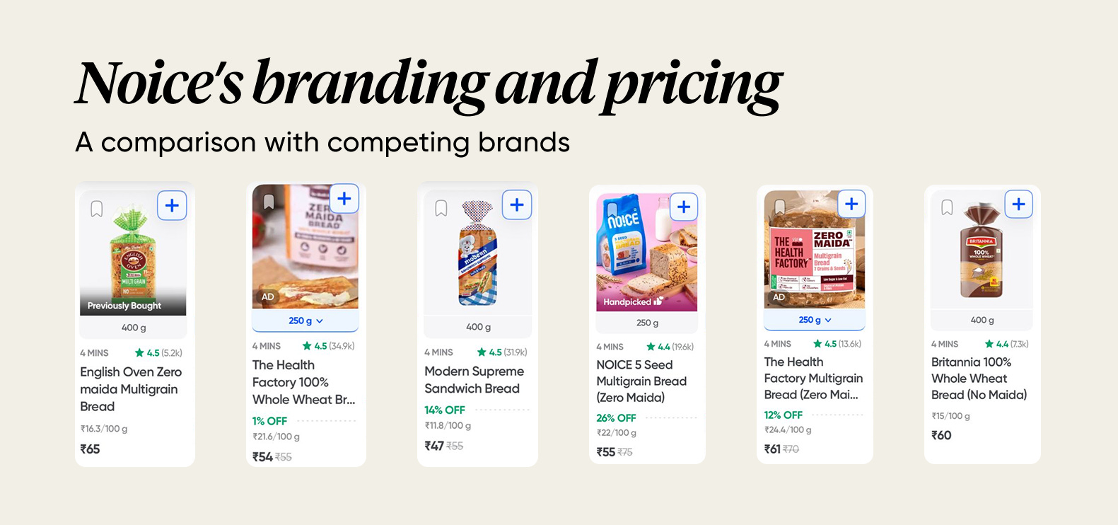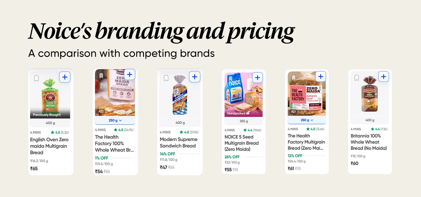 In retail, what gets seen gets sold. Look at Swiggy’s bread section. Noice stands out with distinctive, premium packaging — clean design and quality cues that position it alongside Modern or Britannia.