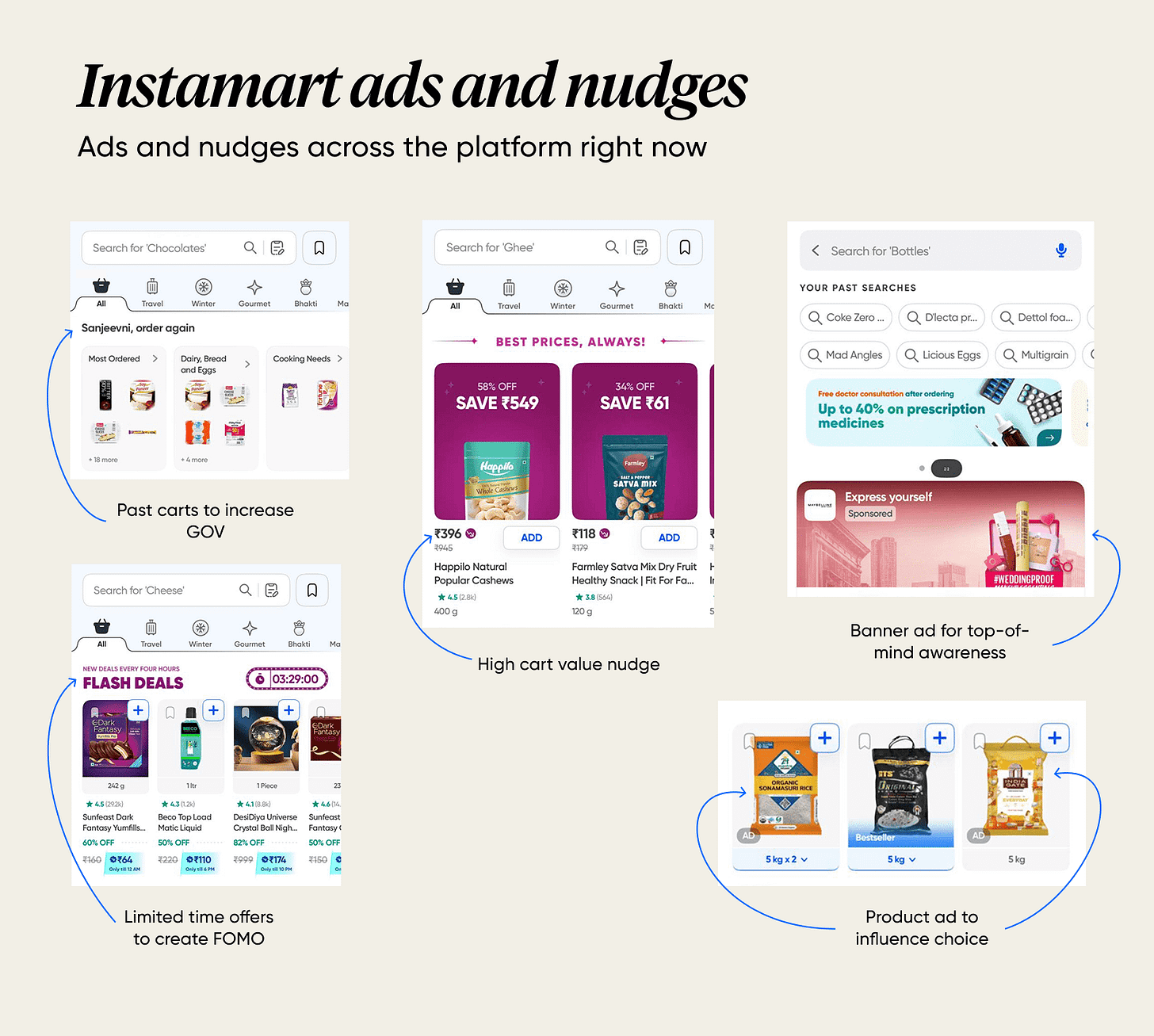 You see them every time you visit the app. On your main dashboard, whenever you search for a product, heck, even on the checkout page. The idea is to make money from sellers (the brands) who want market share in quick commerce.