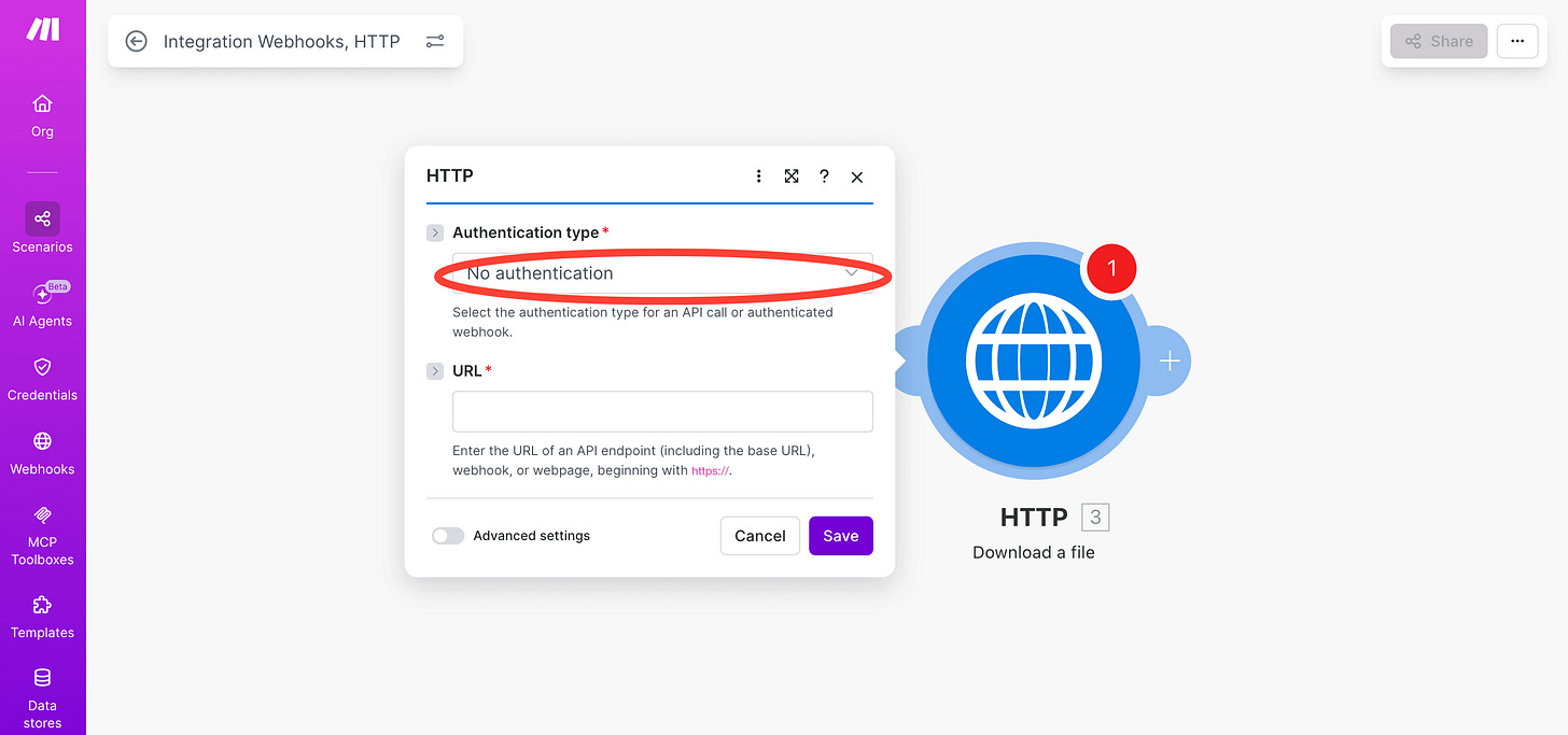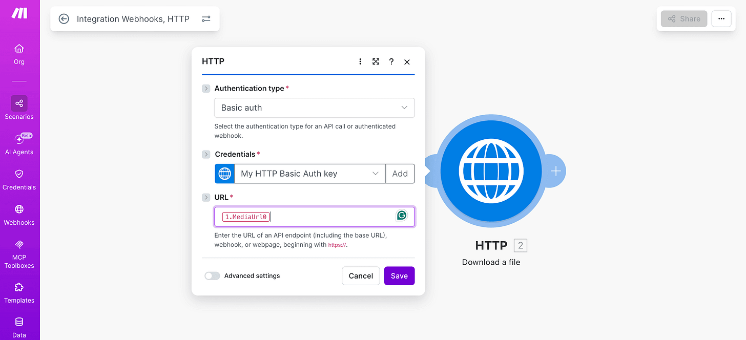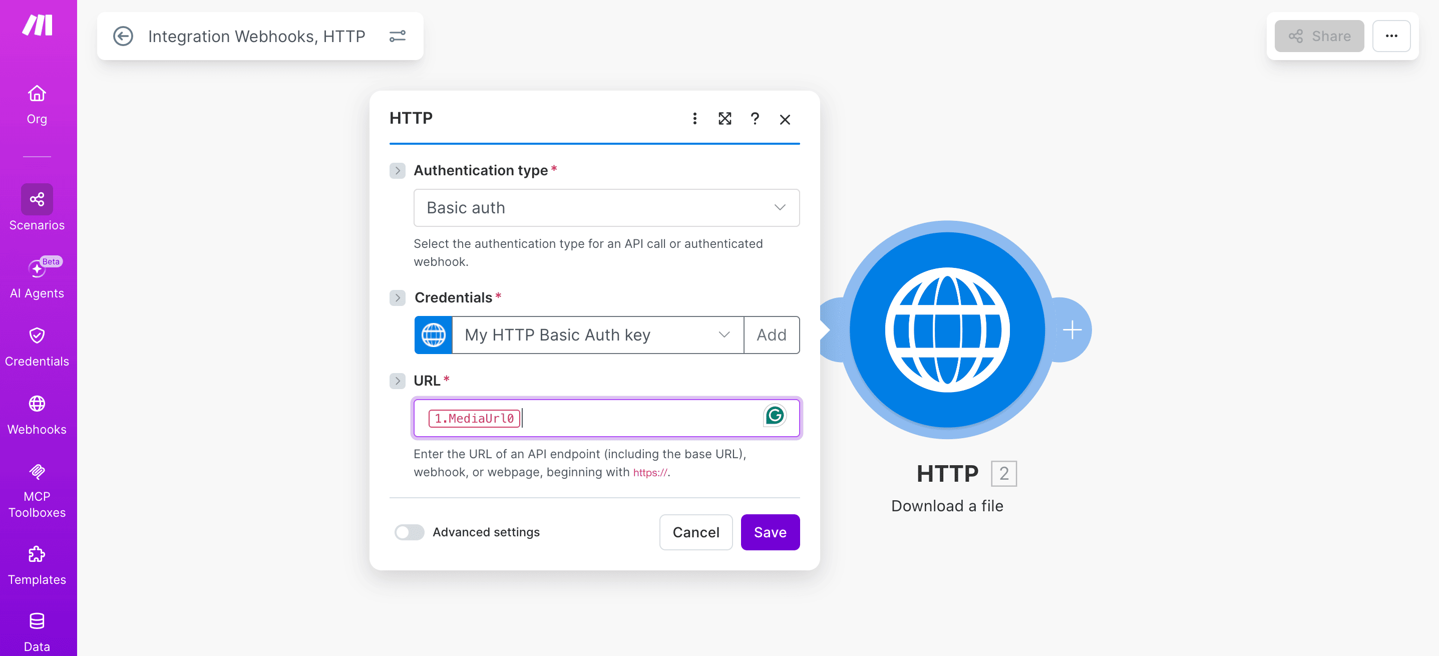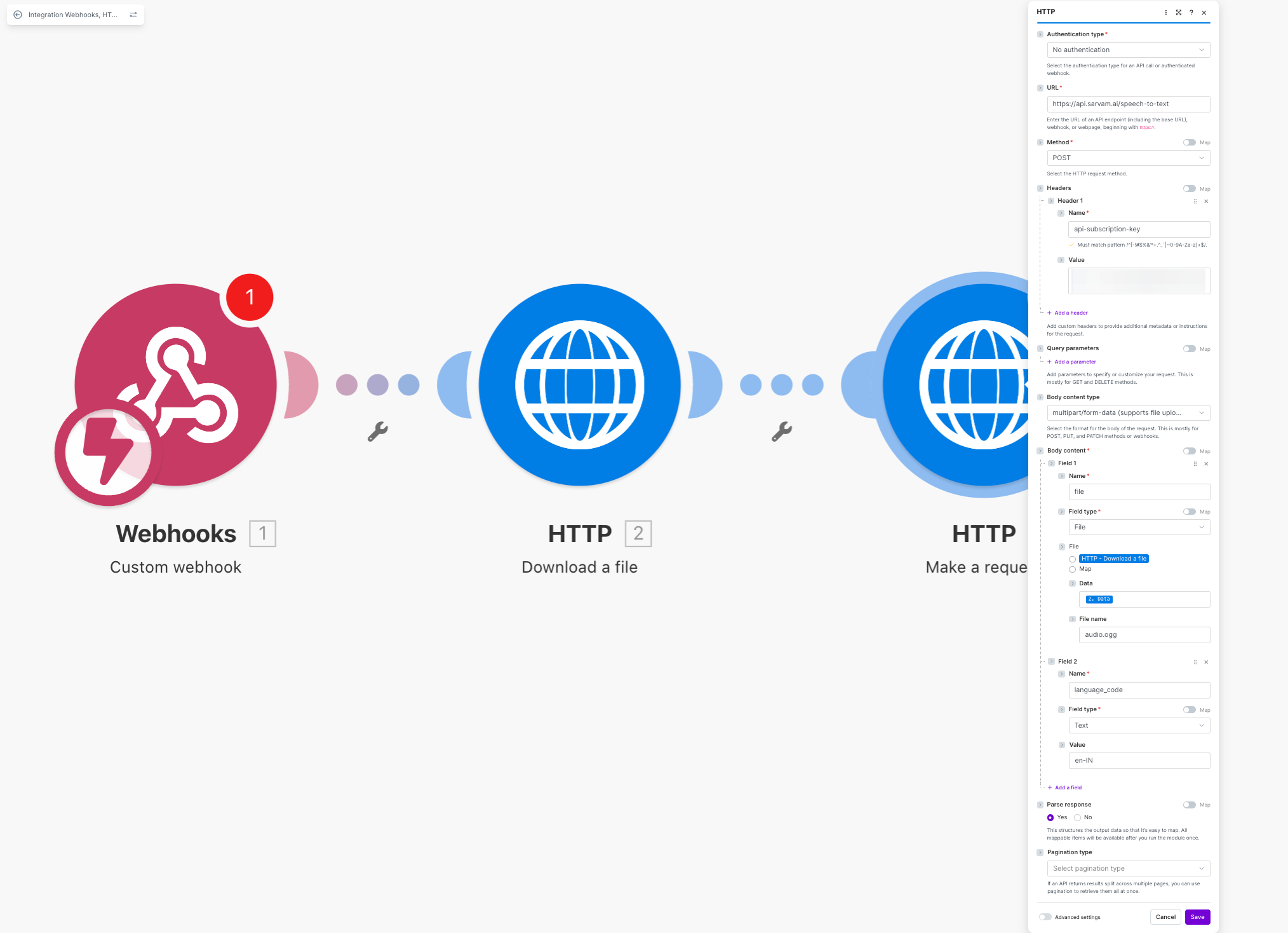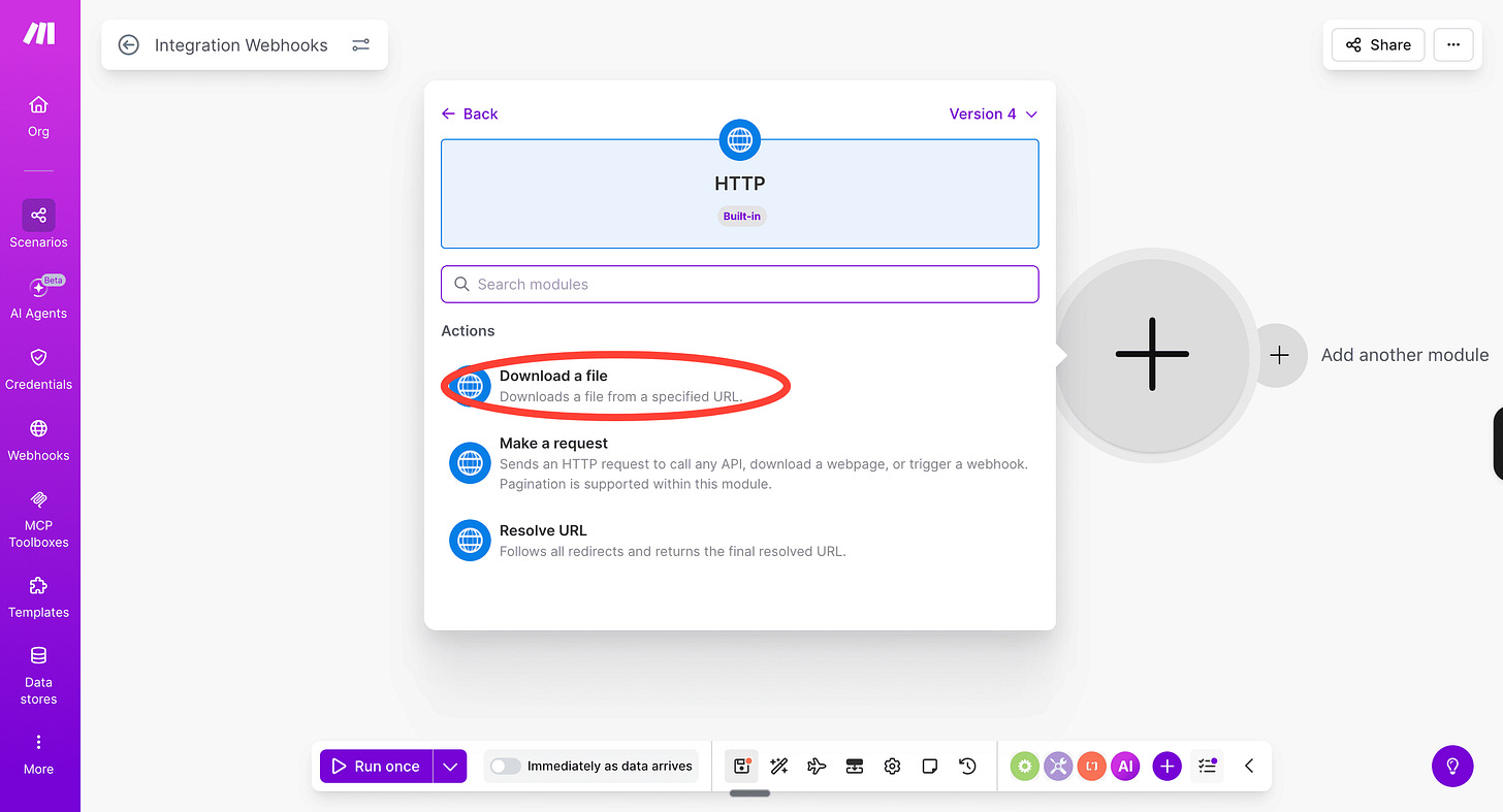 When Twilio receives a voice note, it does not send the audio file to Sarvam directly. Instead, it sends a URL pointing to where the audio file is stored on Twilio’s servers, which Sarvam cannot access. So, we’ll add a “get a file module” to the automation before connecting it to Sarvam.