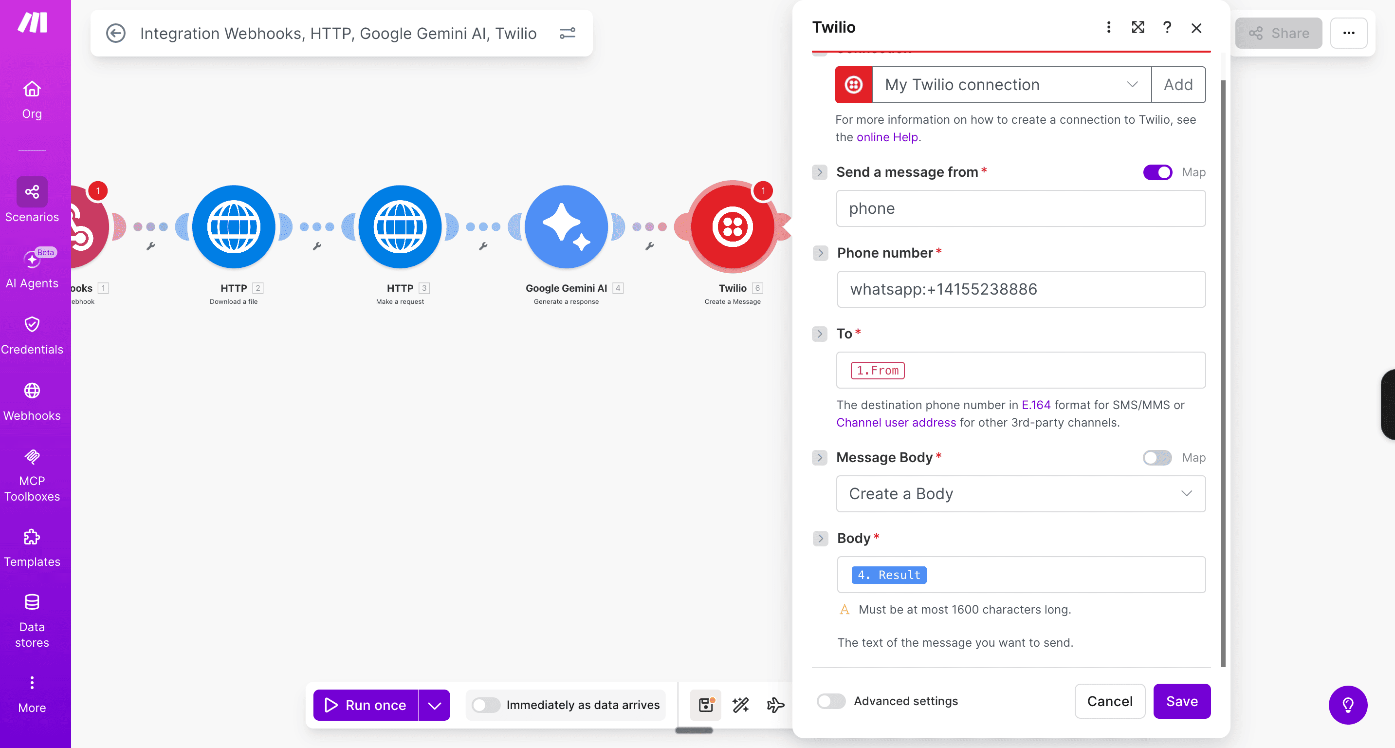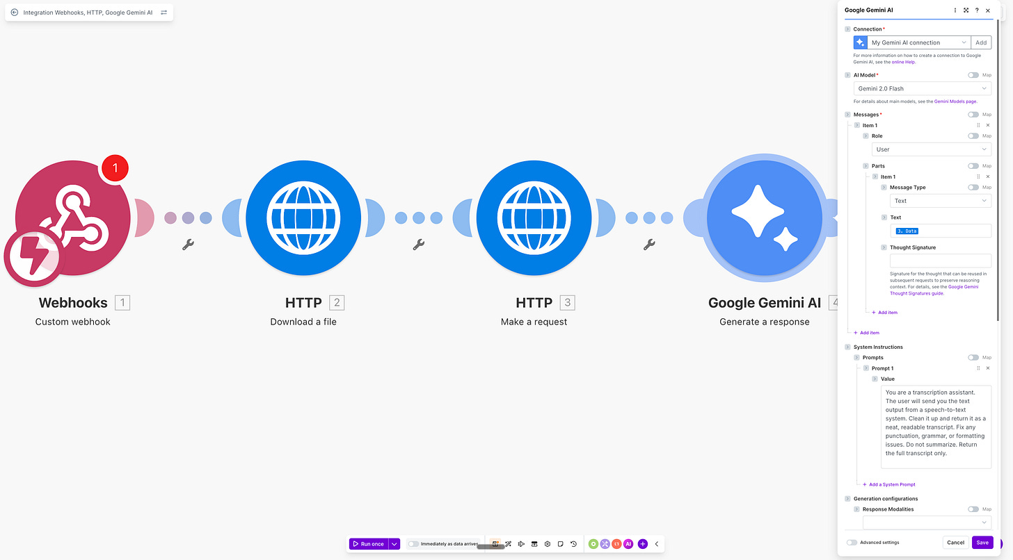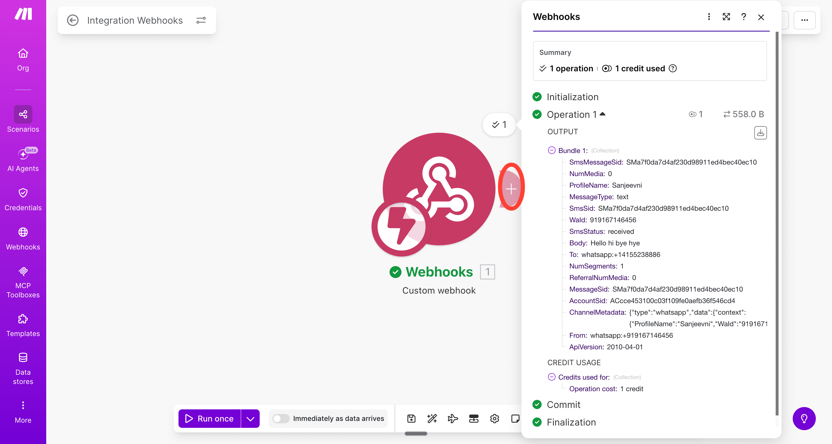 Now, every time you send a WhatsApp message to your Transcriber Bot, it’ll initiate the Make workflow.
