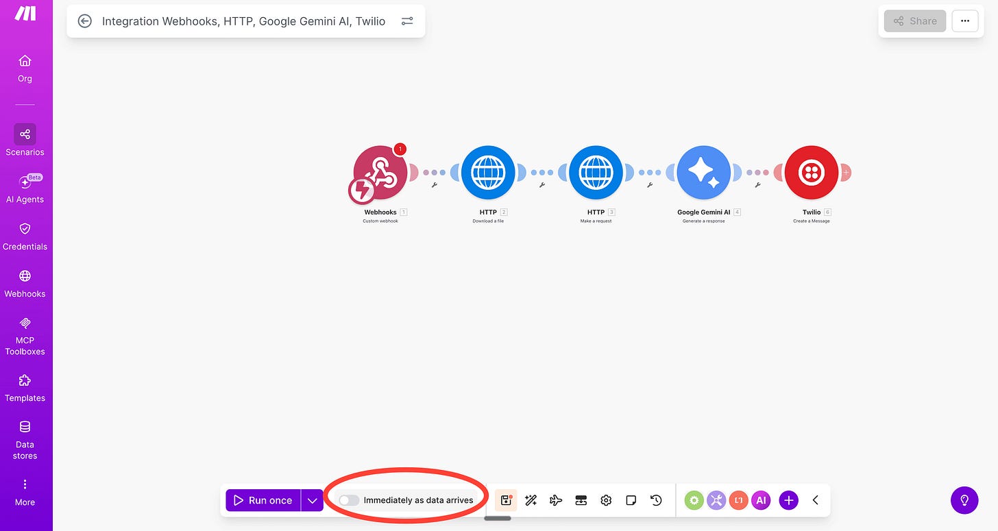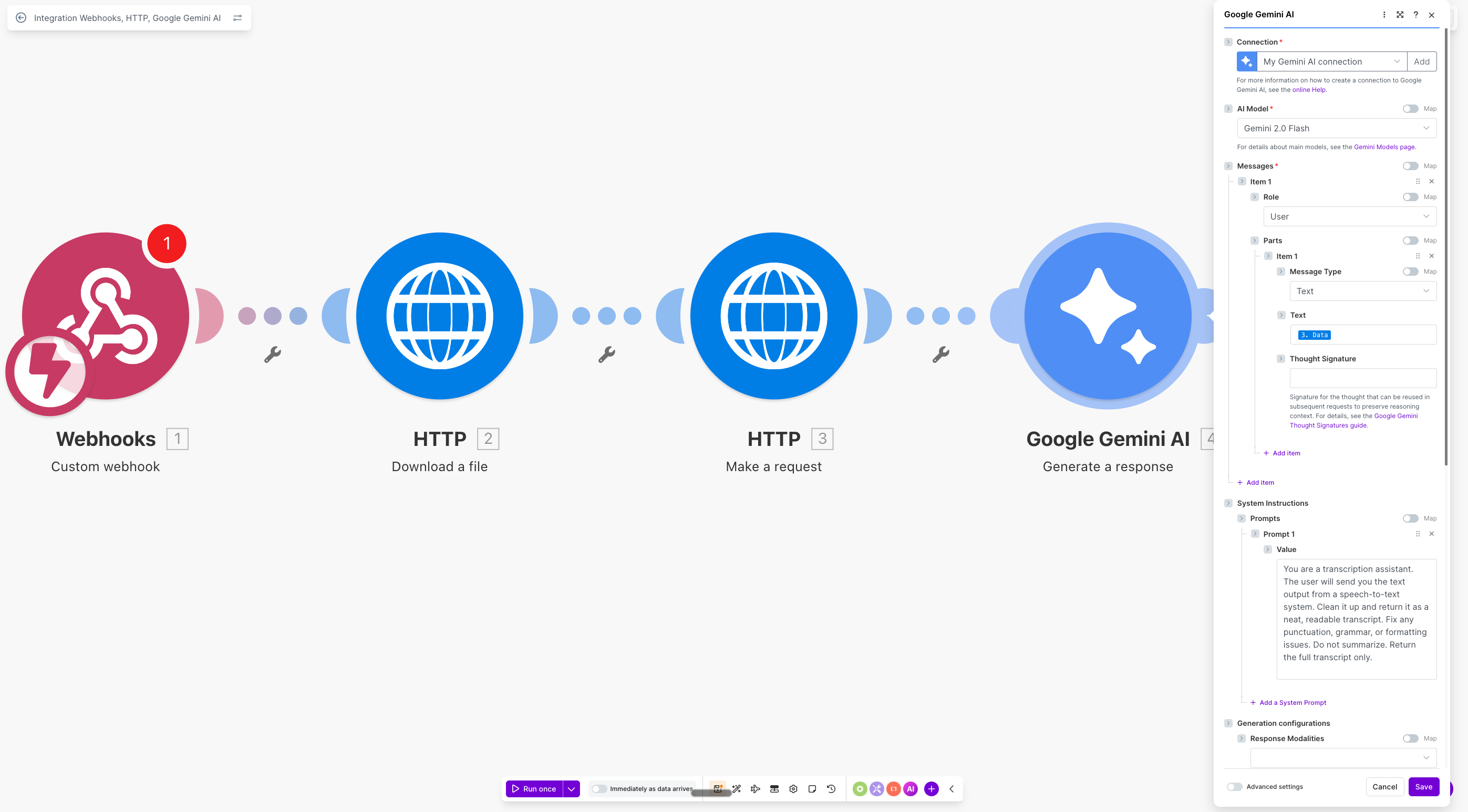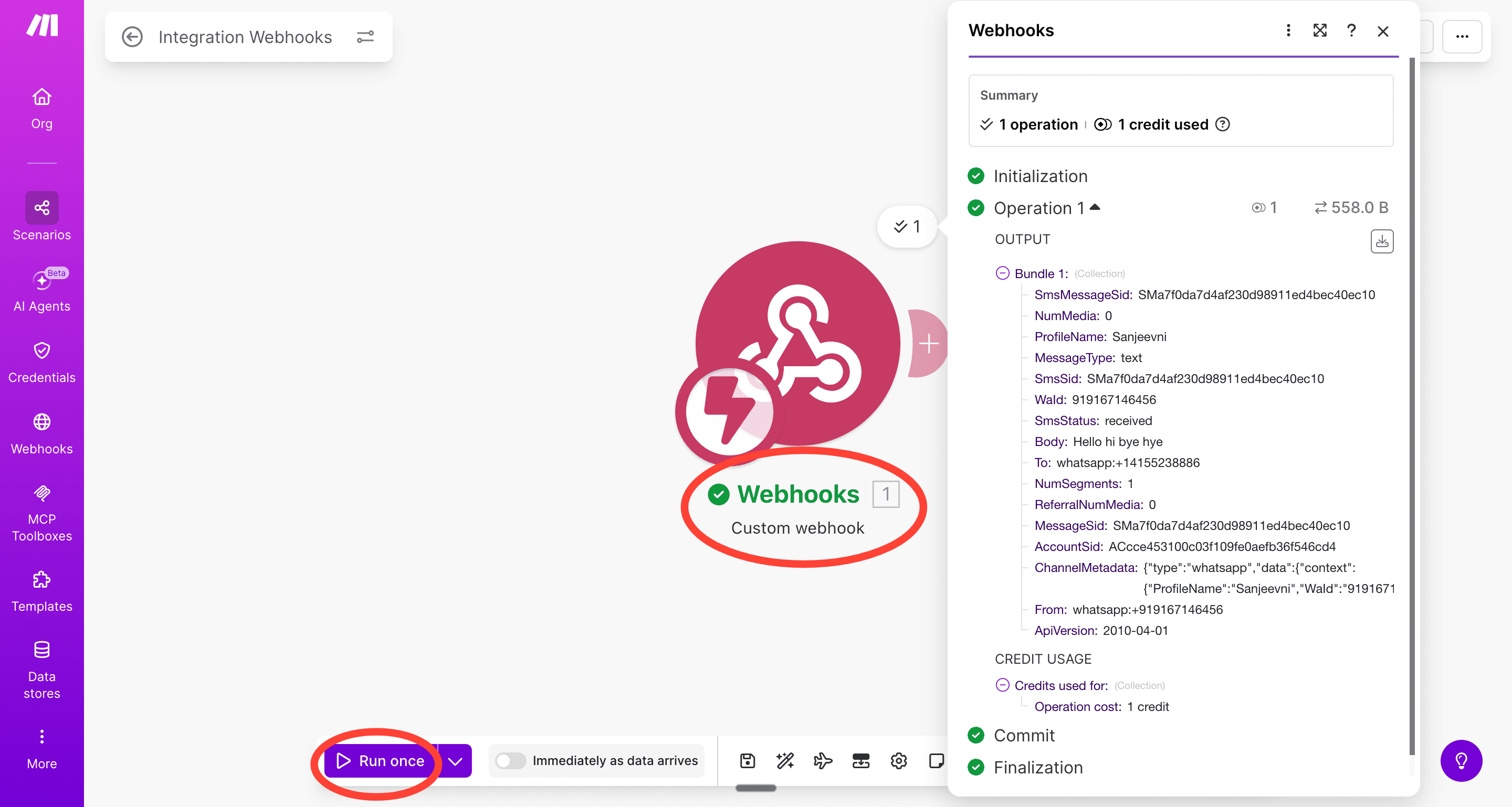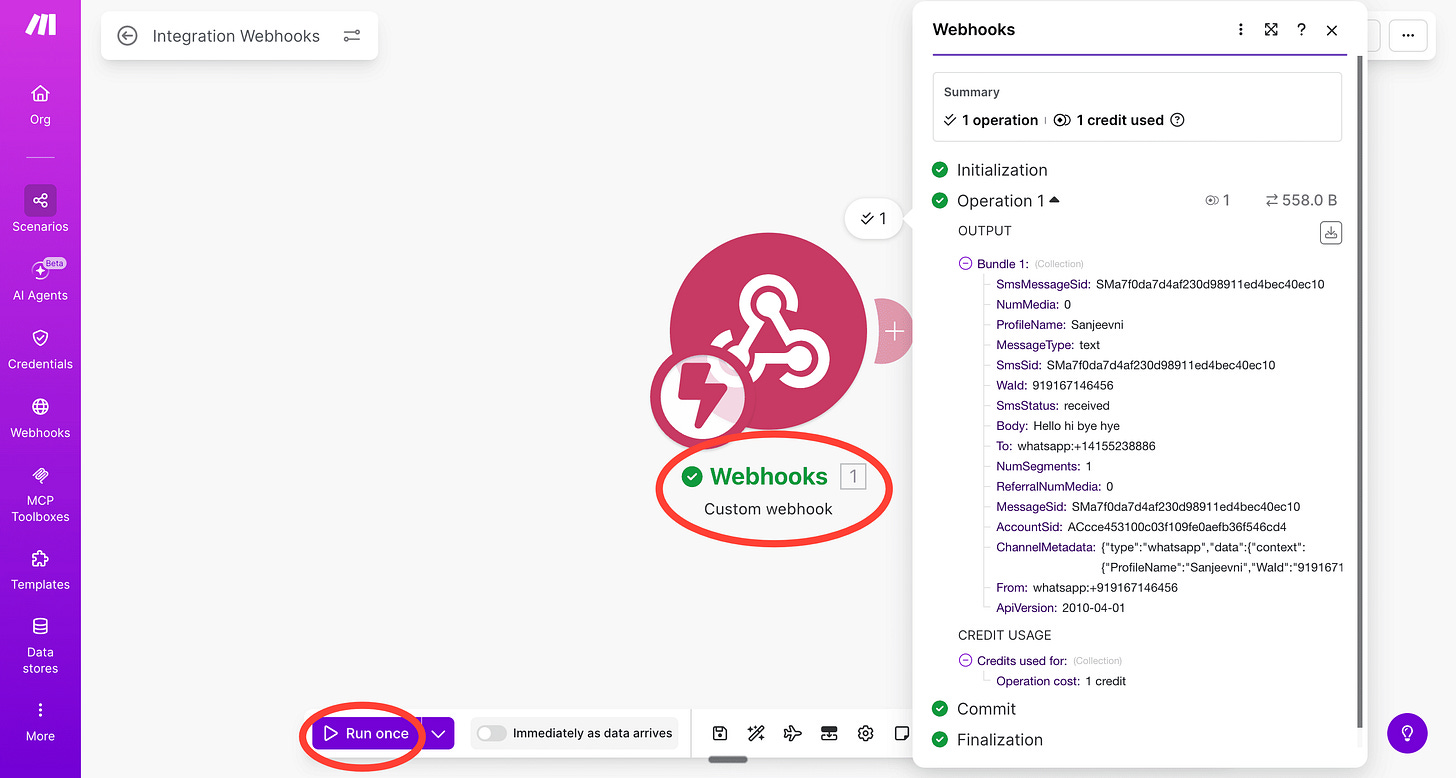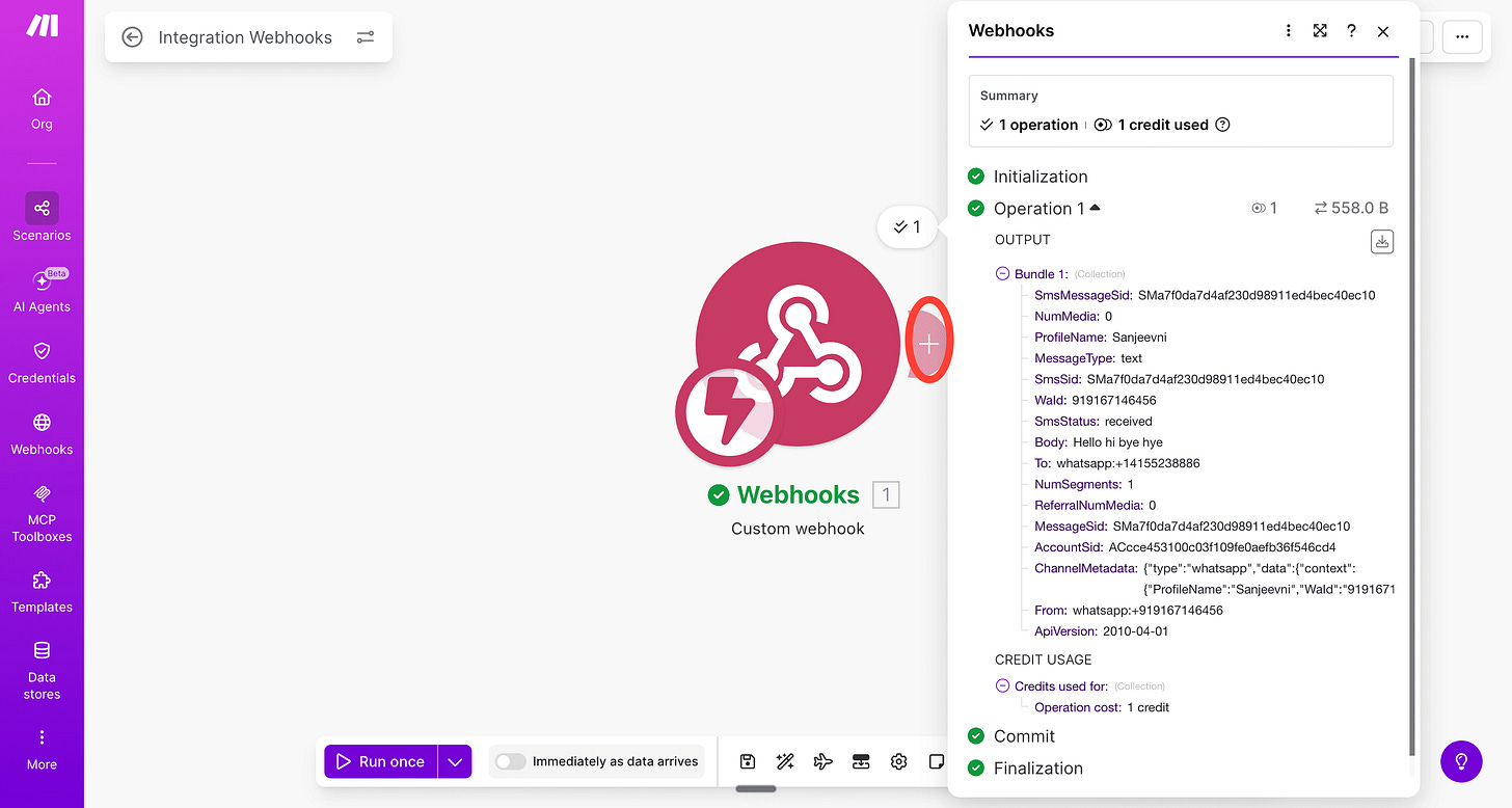Check your automation. Hit the Run command on Make and then send a voice note to your Transcriber Bot on WhatsApp. You should see the Webhook block light up. This means your automation is running.