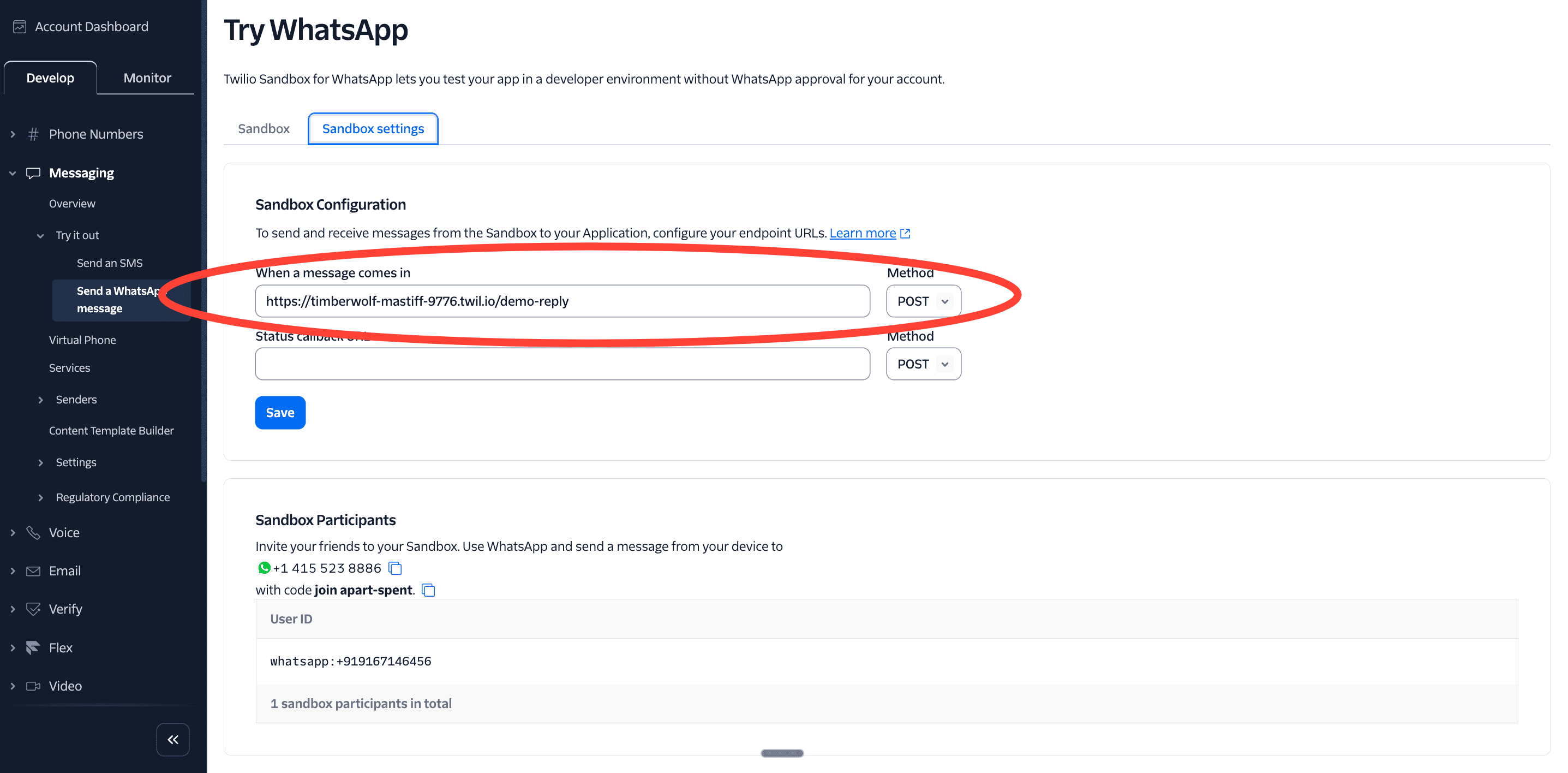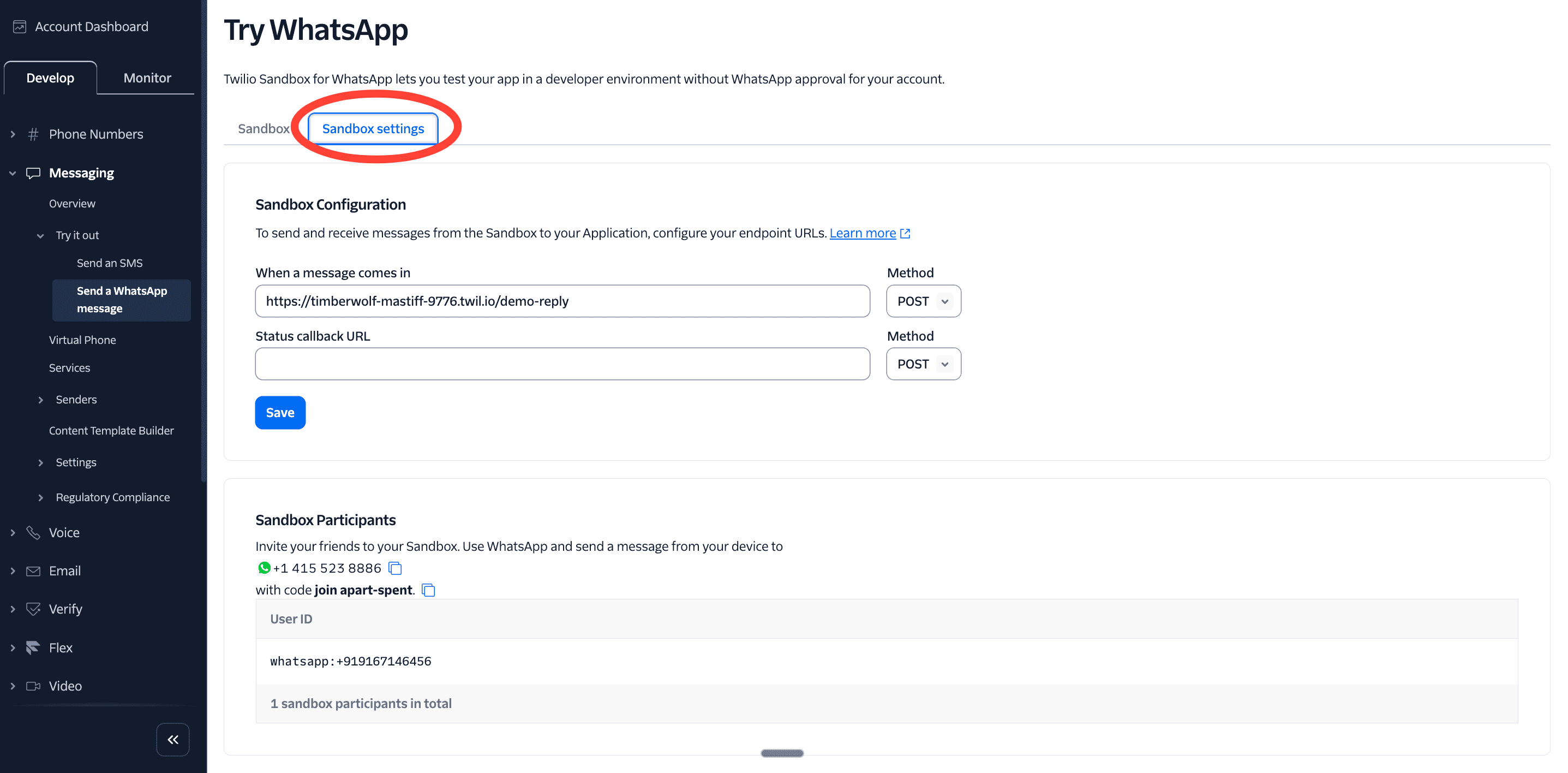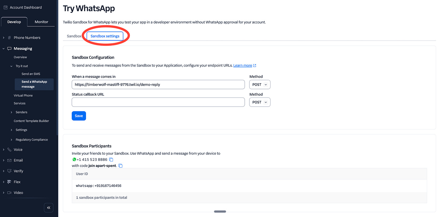 Go back to Twilio and switch from the Sandbox Tab to the Sandbox Settings tab.
