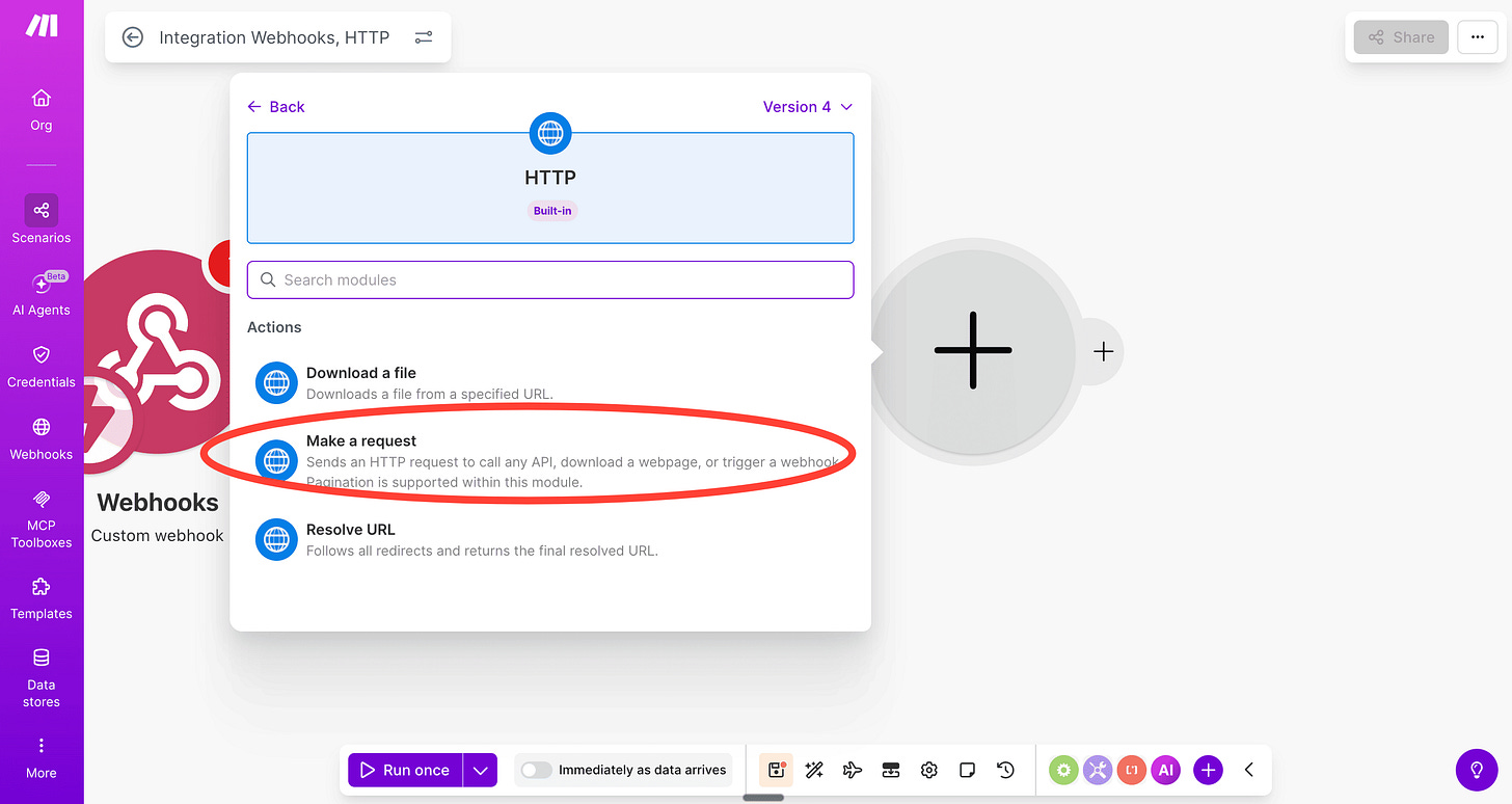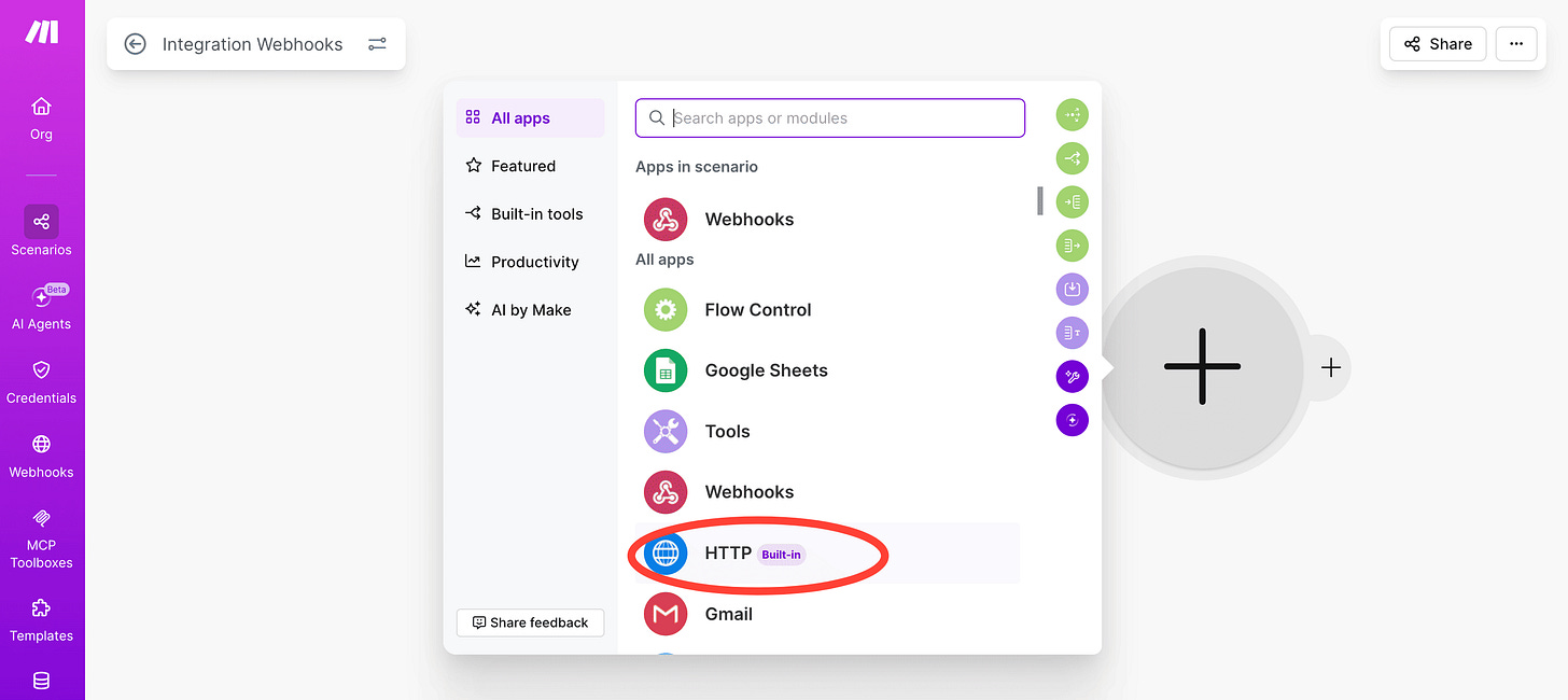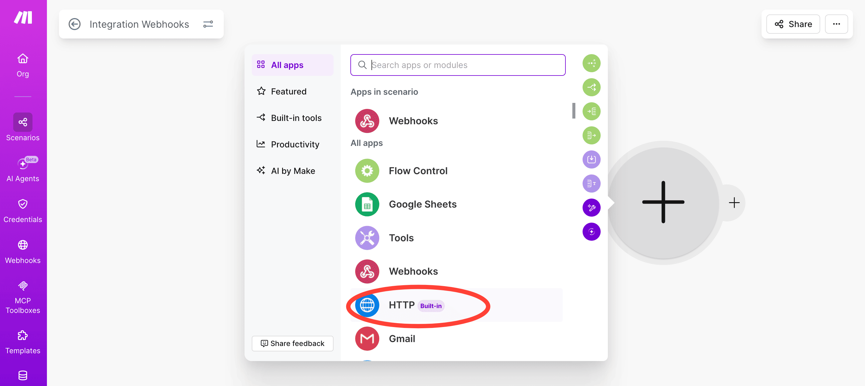 Click the “+” on the canvas after the last HTTP block and search for “HTTP” and select “Make a request”.