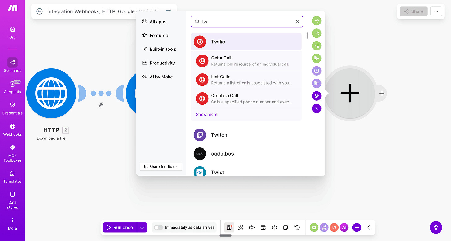 1. Click “+” after the Gemini block, search for “Twilio”. Click on " Show More” and select “Create a Message”.