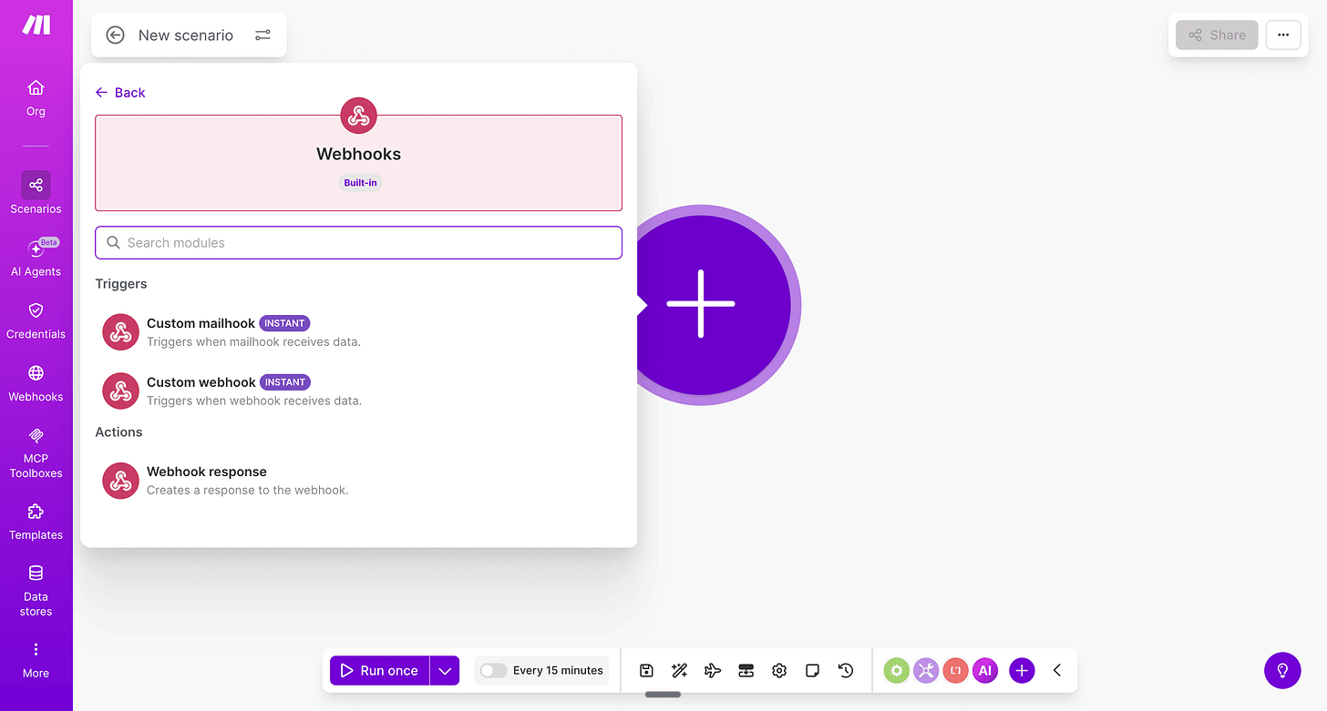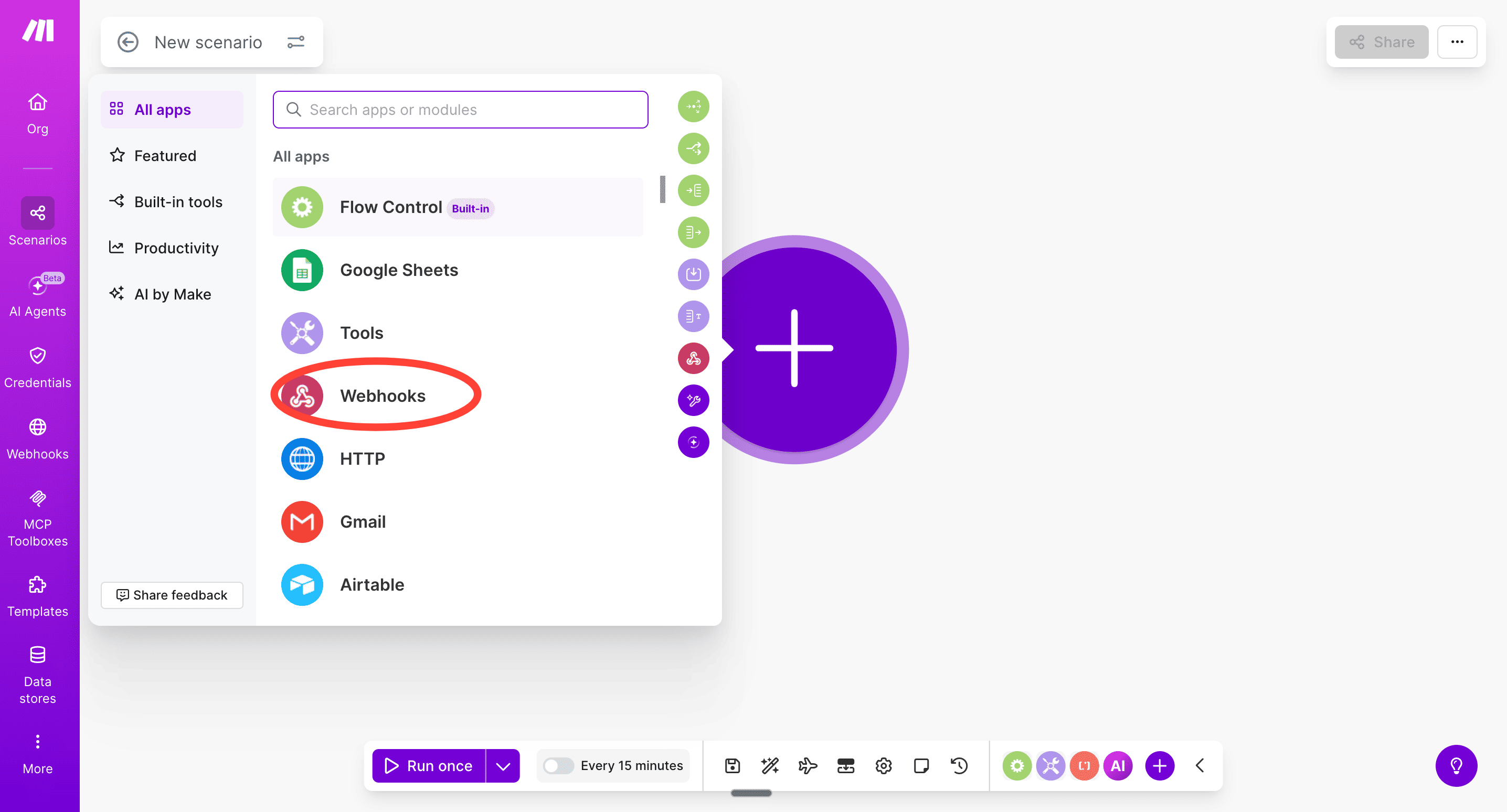 You should see an empty canvas with a large “+” in the middle, like this. Click it, then select Webhooks from the pop-up menu.