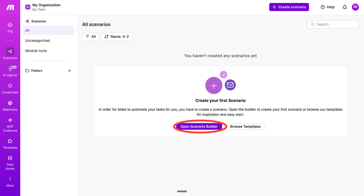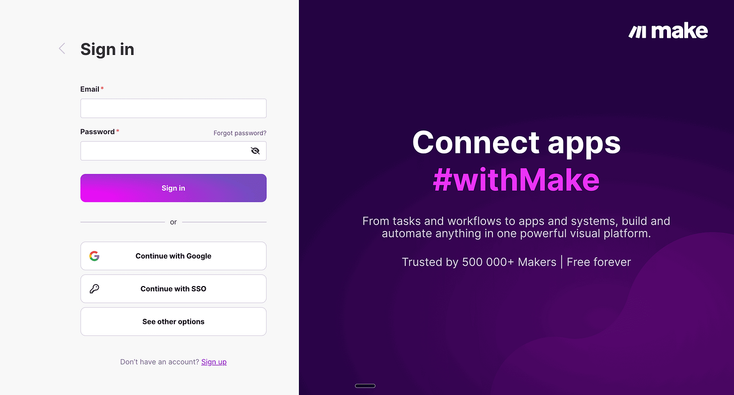 2. Select Continue with Google. This will let you log in directly with your Google Account. Congratulations, your Make account is ready.