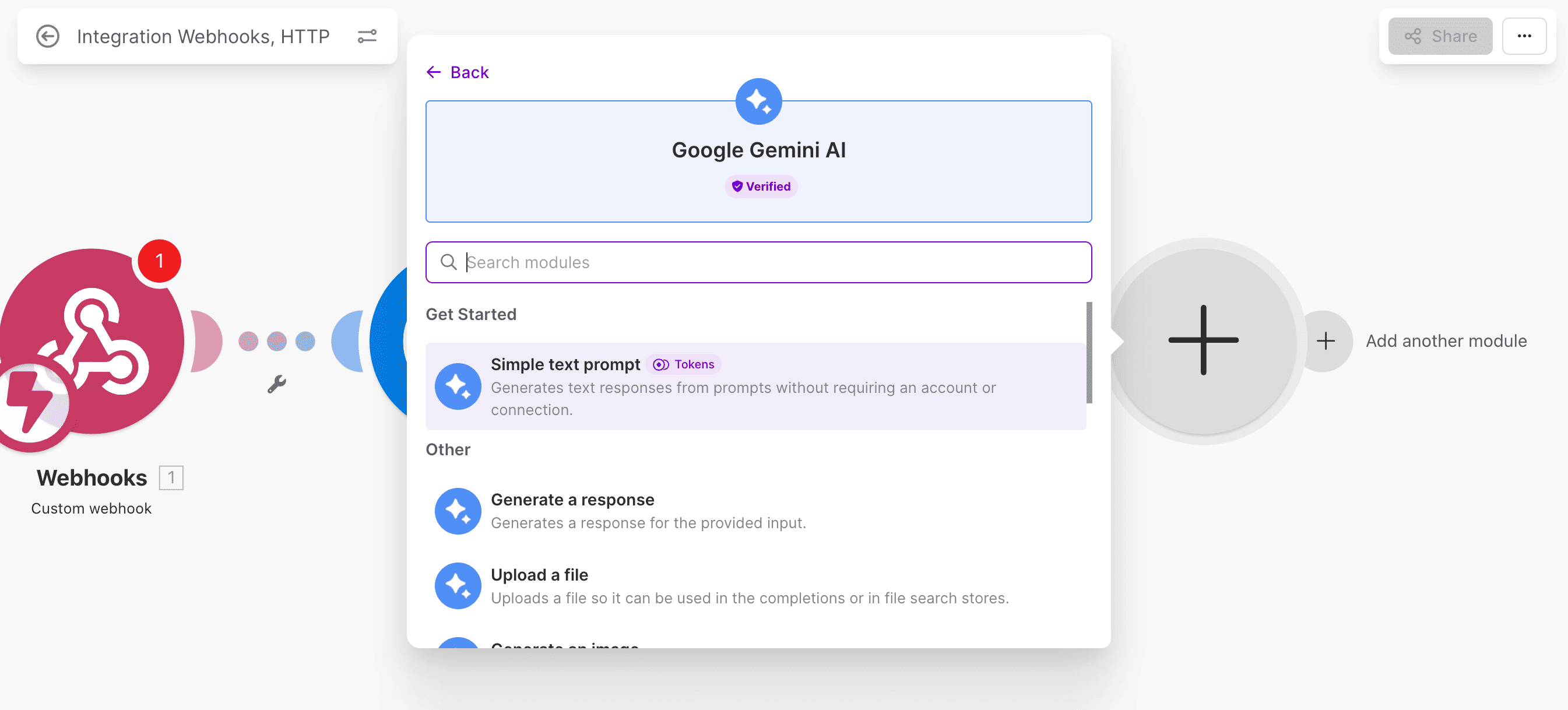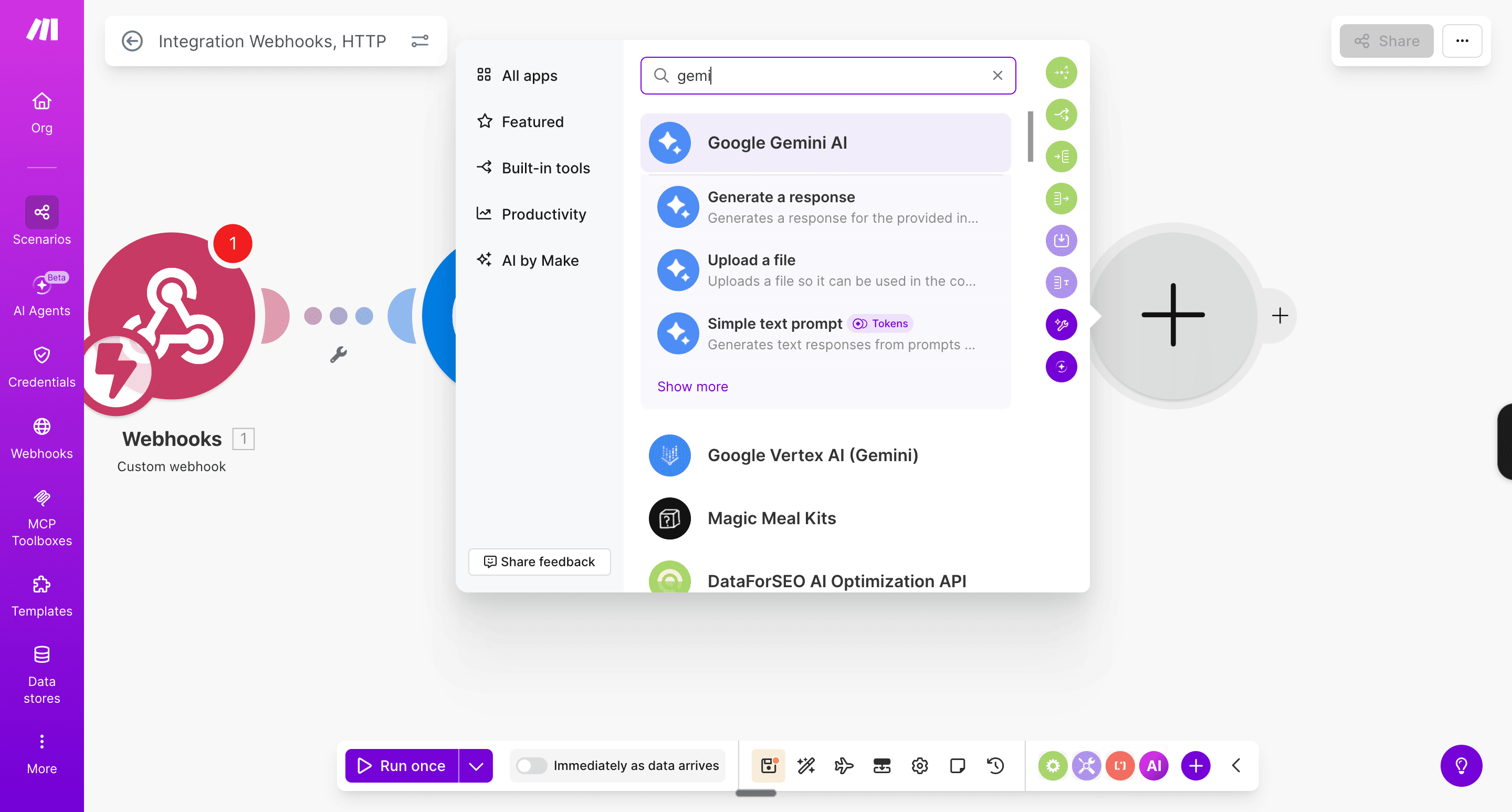 1. Click on the ‘+’ next to your Sarvam block on Make and find Google Gemini AI.
