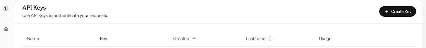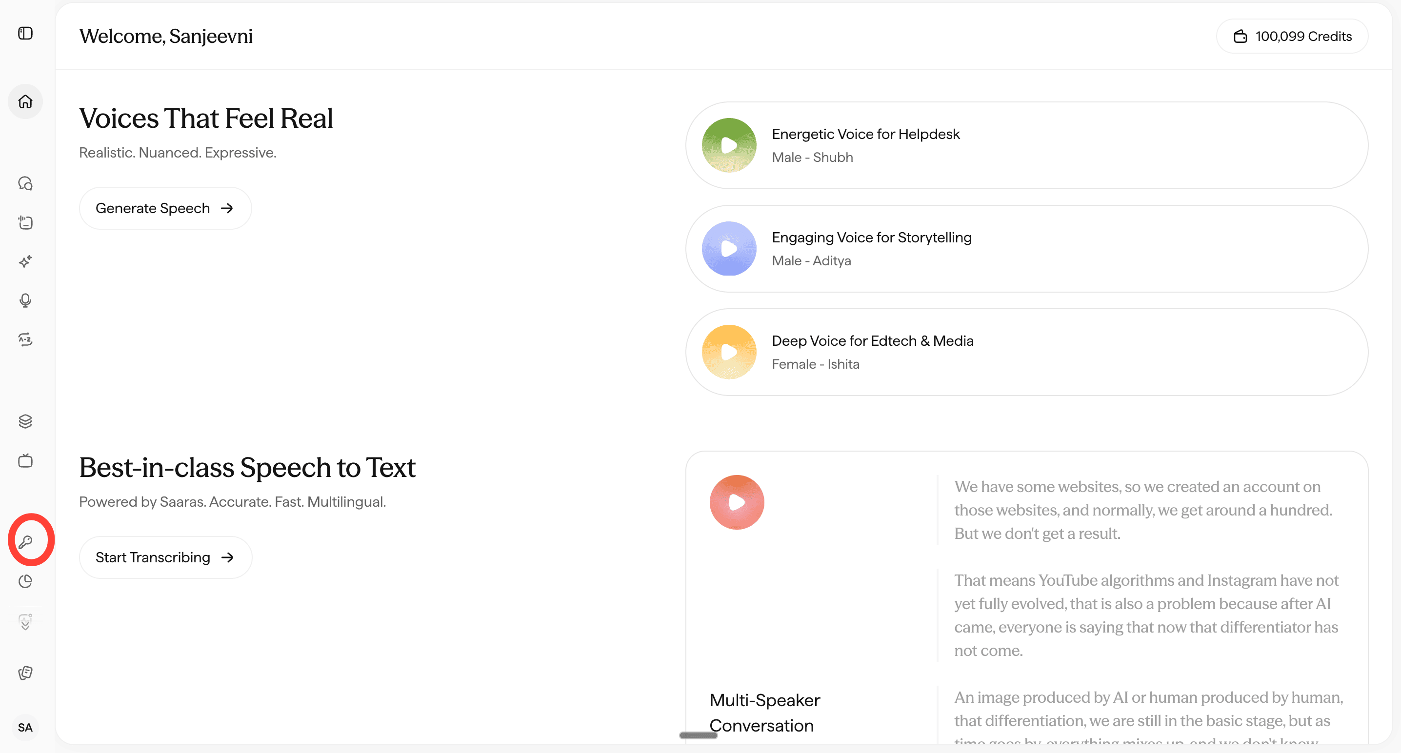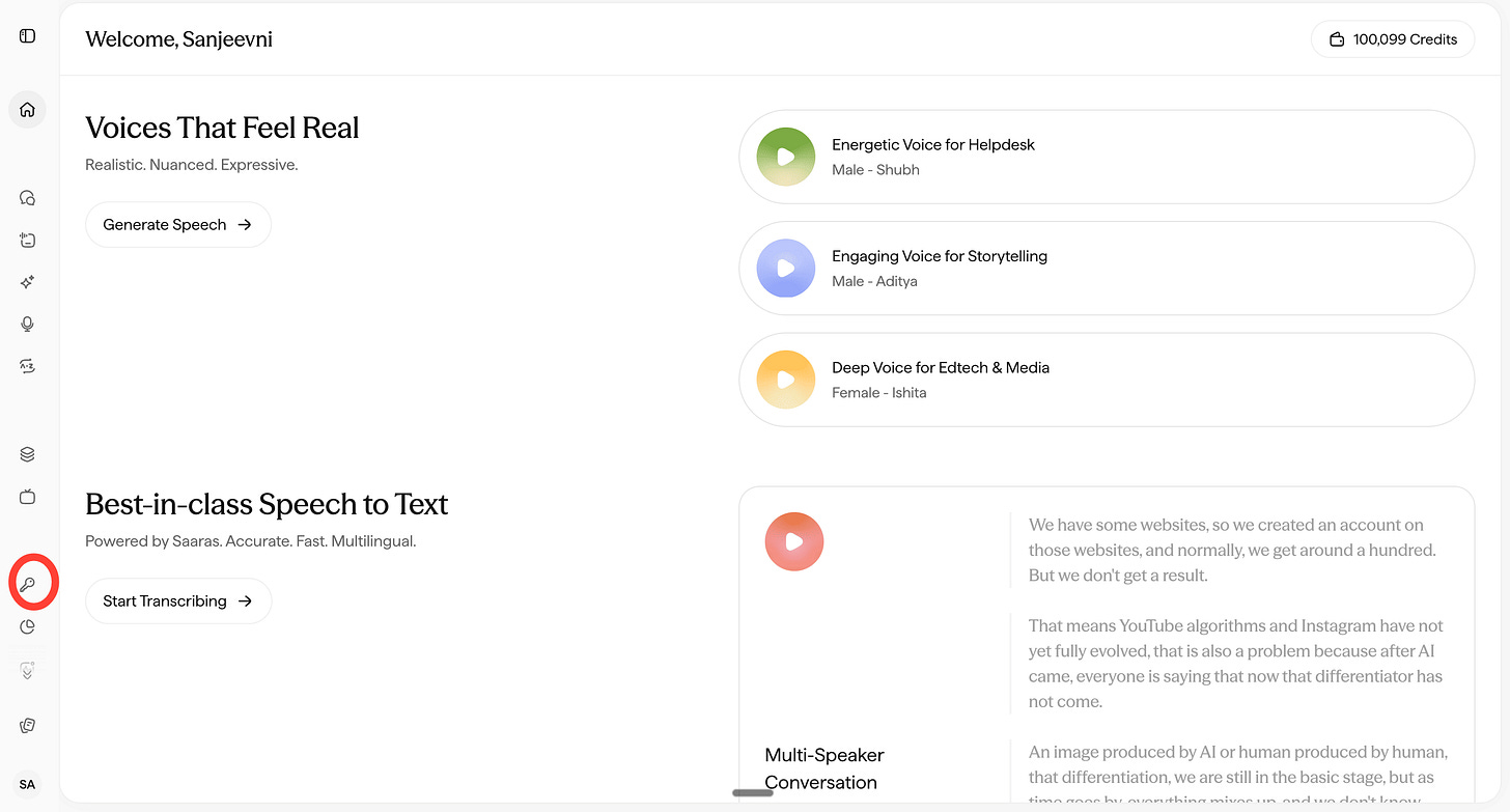 Click on the Key icon on the left.Click on Create Key. Enter a name for your Key. Sarvam will generate a secret key for you. Copy this into your Make workflow now.