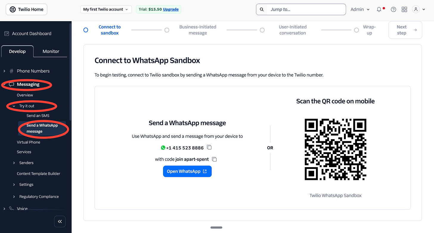 3. Now check the Develop tab on the left. Click on Messaging, click on the Try it out drop-down and select Send a WhatsApp message. This will open up the Connect to WhatsApp Sandbox.