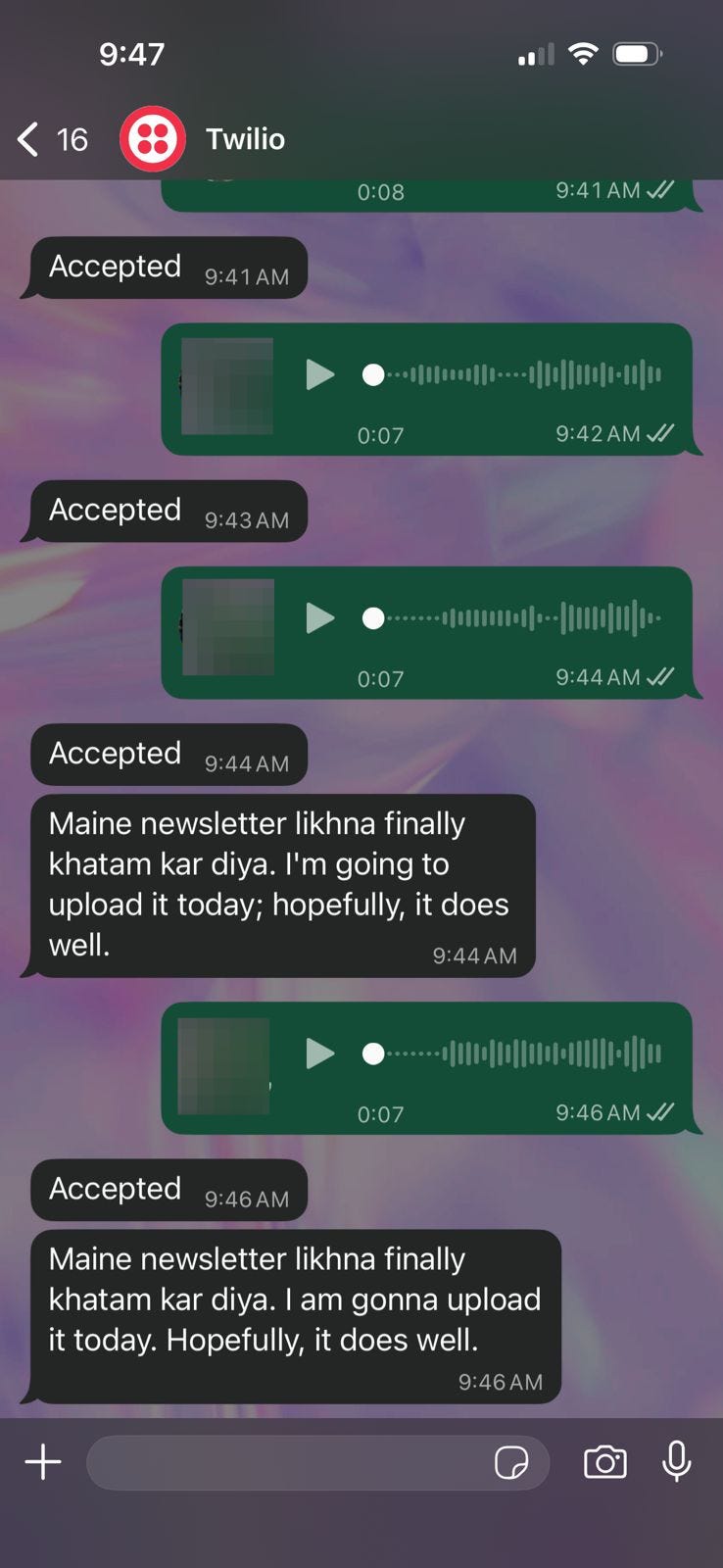 But here’s what it does do: it takes a voice note in any Indian language, transcribes it in seconds, and delivers it back to you on WhatsApp. No app to download. No UI to build. No server to maintain. Just a number saved in your contacts.