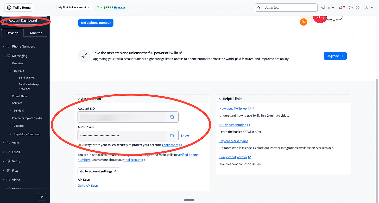 Now head over to the Twilio Console and click Account Dashboard. You should see the Account SID and Auth Token once you scroll down. Copy these details and paste them in the Username and Password input box in Make.