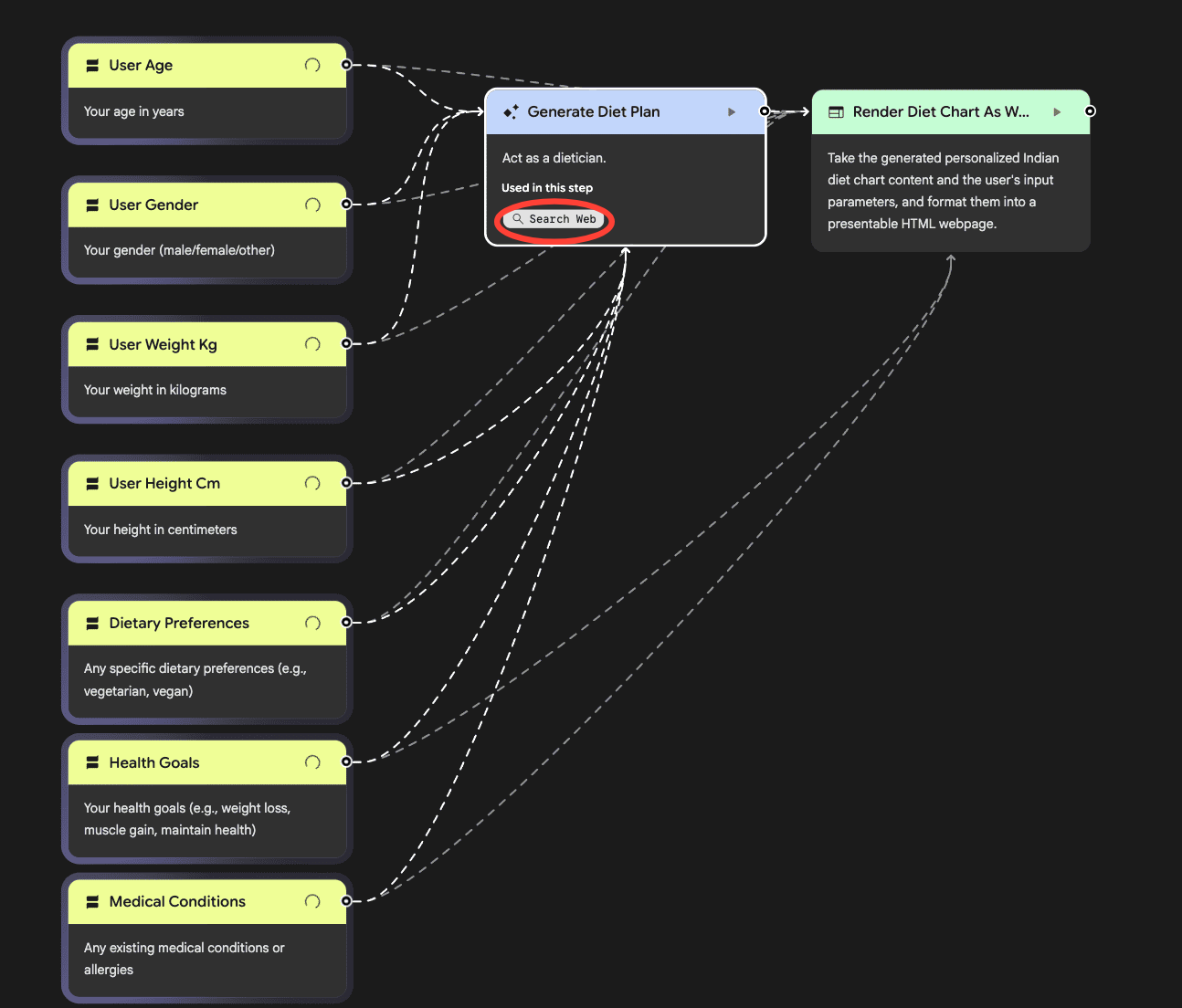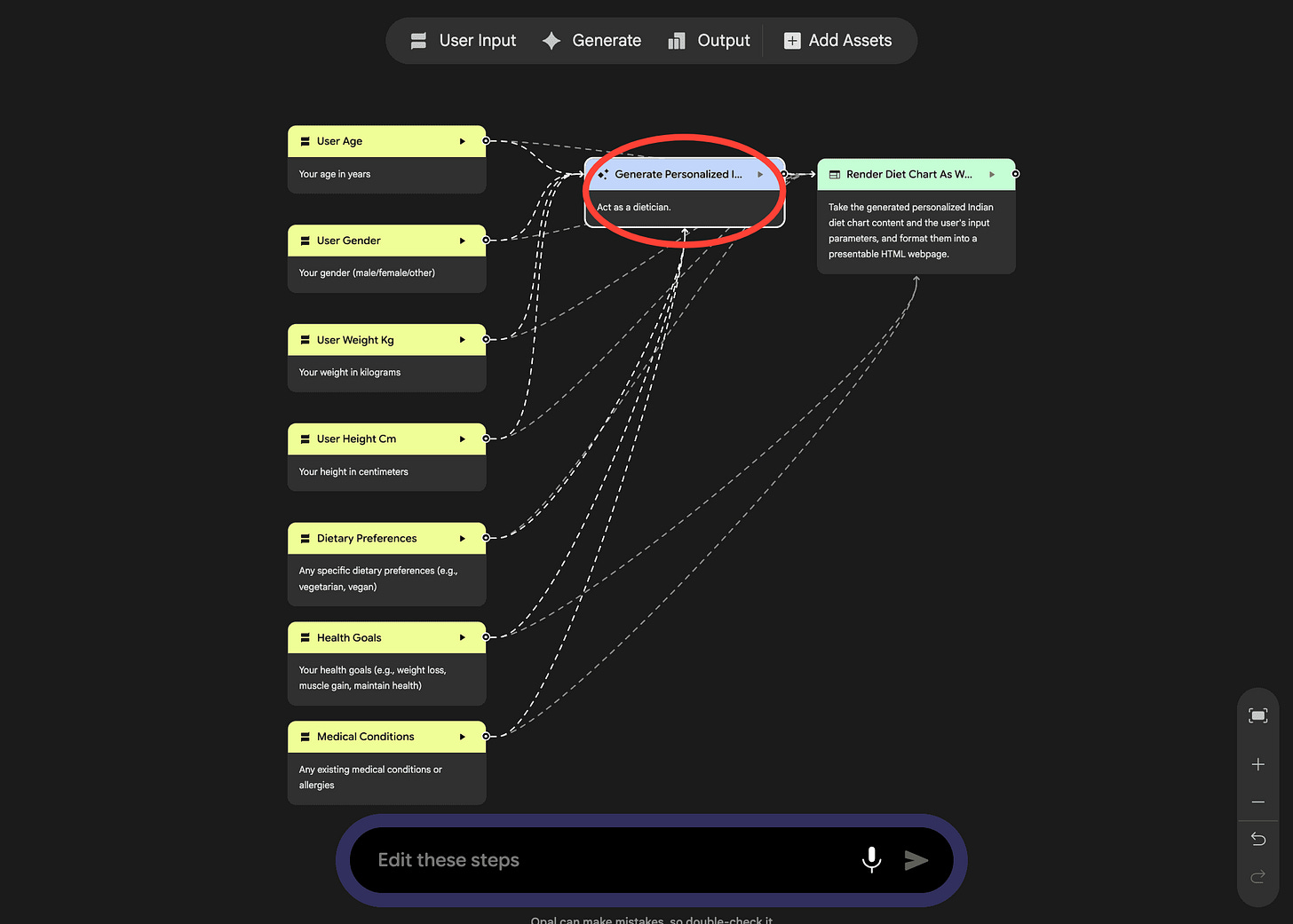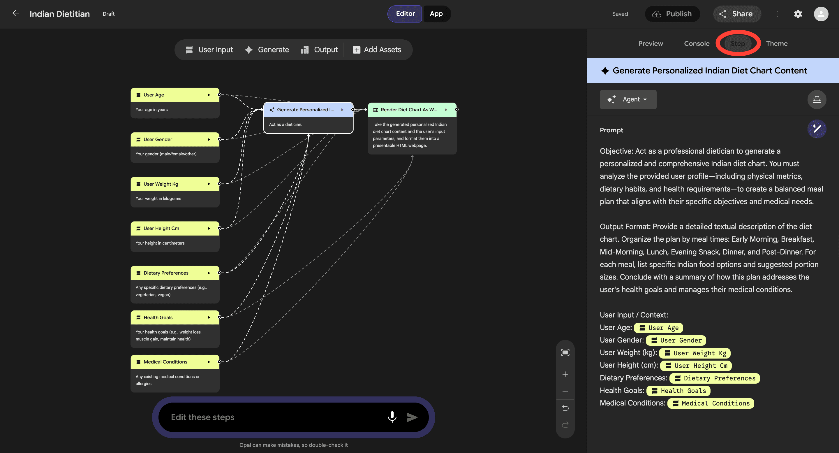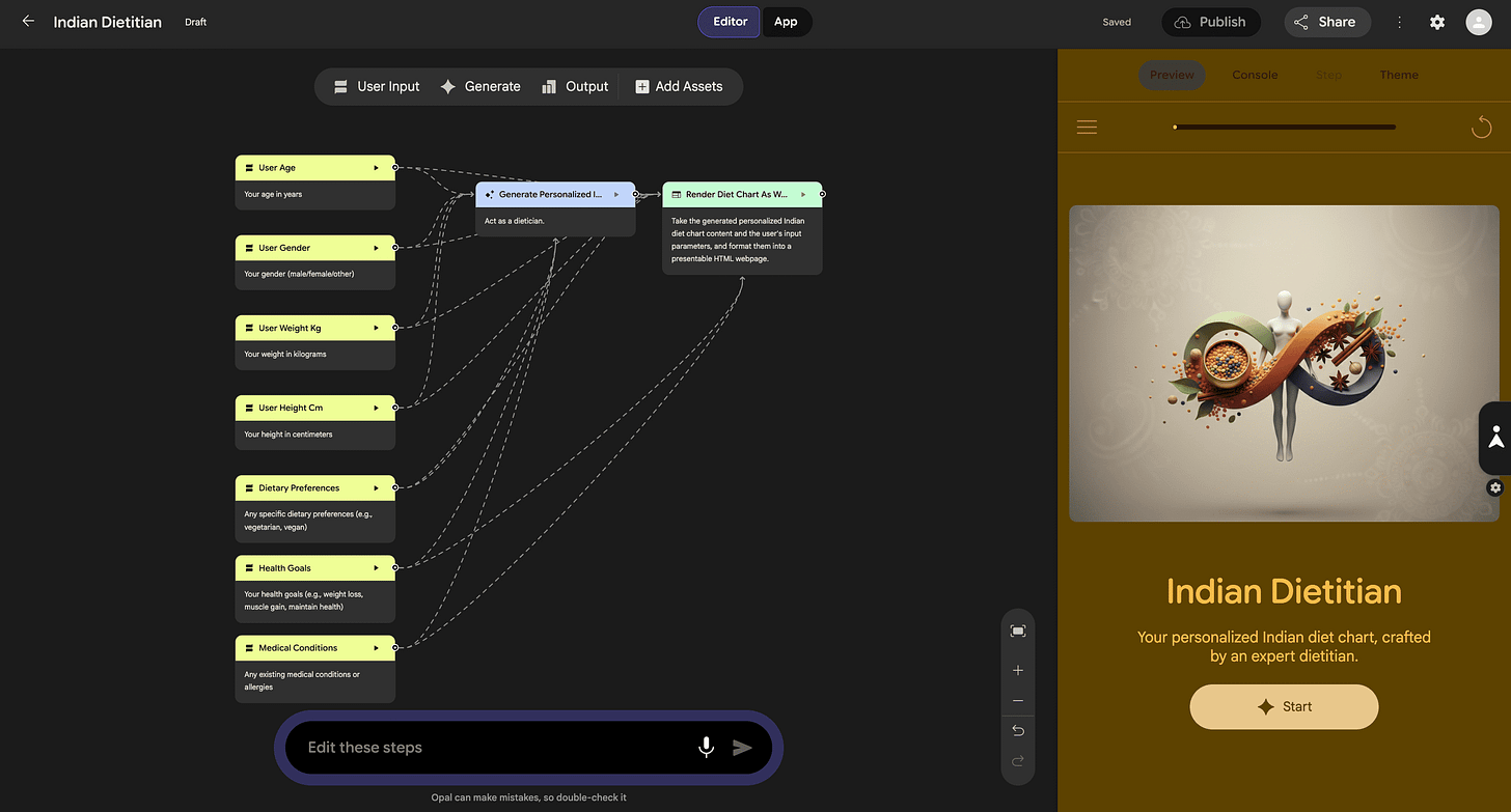 Opal has correctly understood the different user inputs it’ll need to create a usable diet chart. This includes user age, gender, weight, height, dietary preferences and medical conditions. Then the tool uses its AI layer to figure out a response. And finally, it displays the response in a chart format.