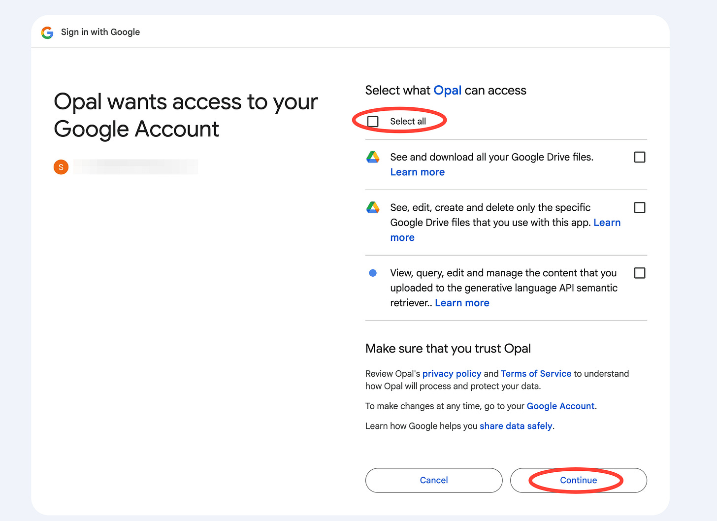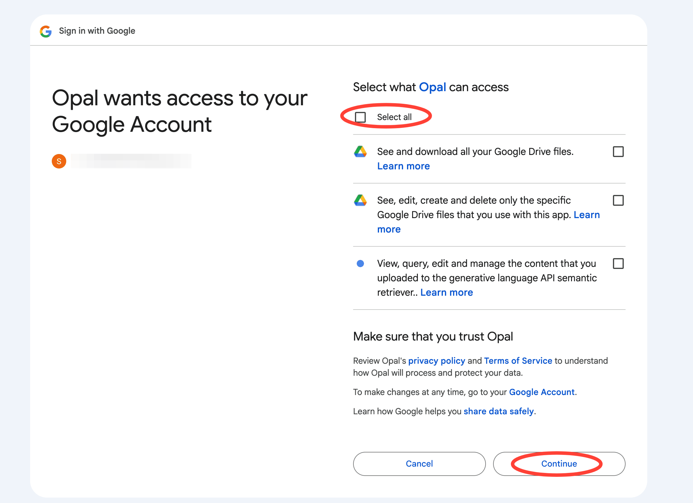 3. Next, Google will ask you for permissions to your Google Drive and access to see, edit, and change your files. Read the terms, click on Select all and click on Continue.