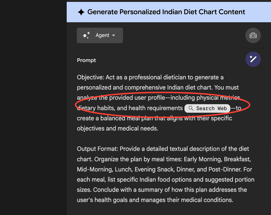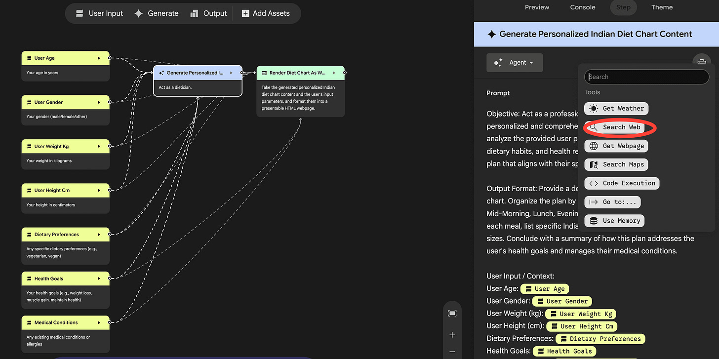 Here, you can fine-tune how your mini-App uses AI. You can choose your Agent under the Agent tab, and decide which Google function to use from the Toolkit. For this project, I want to use the Search web tool.