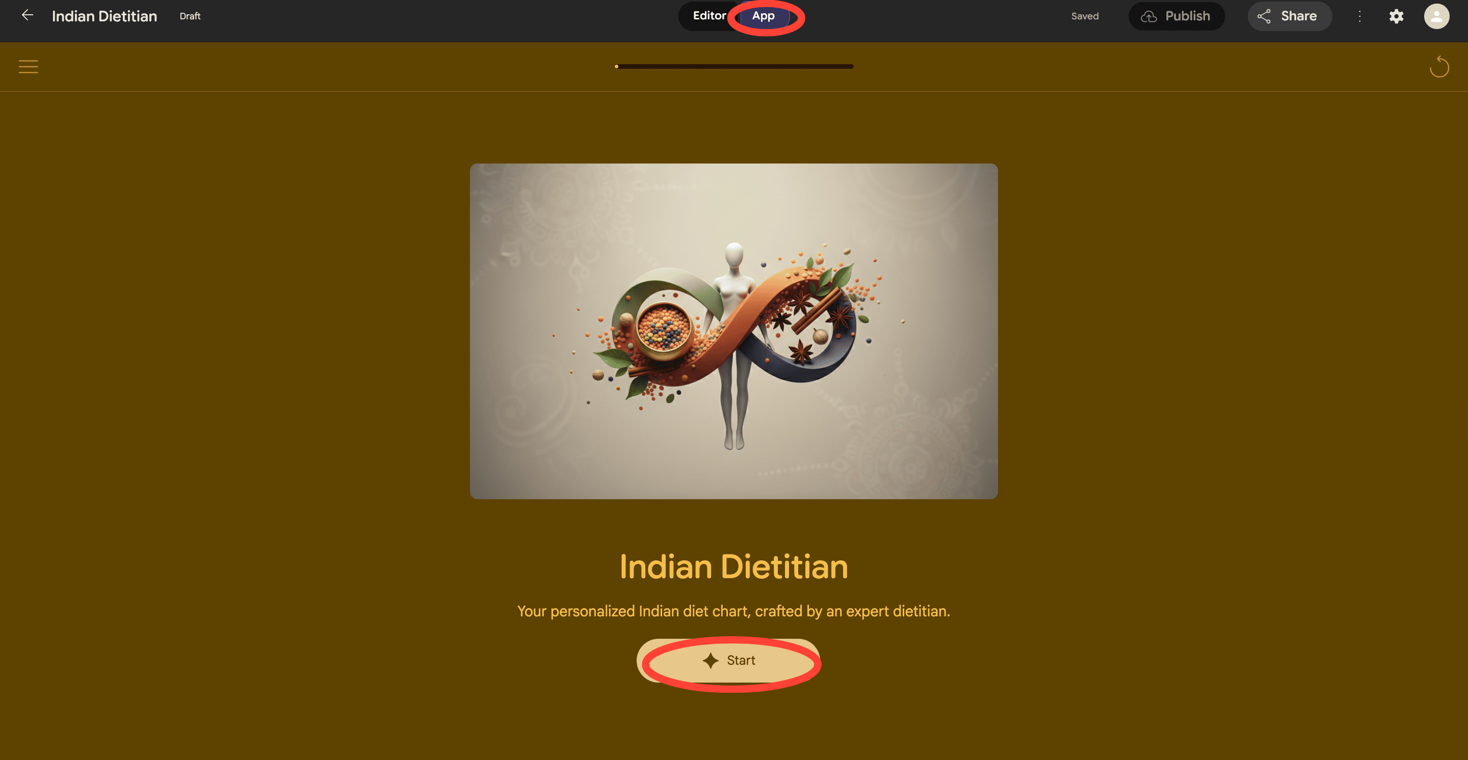 5. To experience your app, switch from the Editor tab to the App tab. And click on Start.