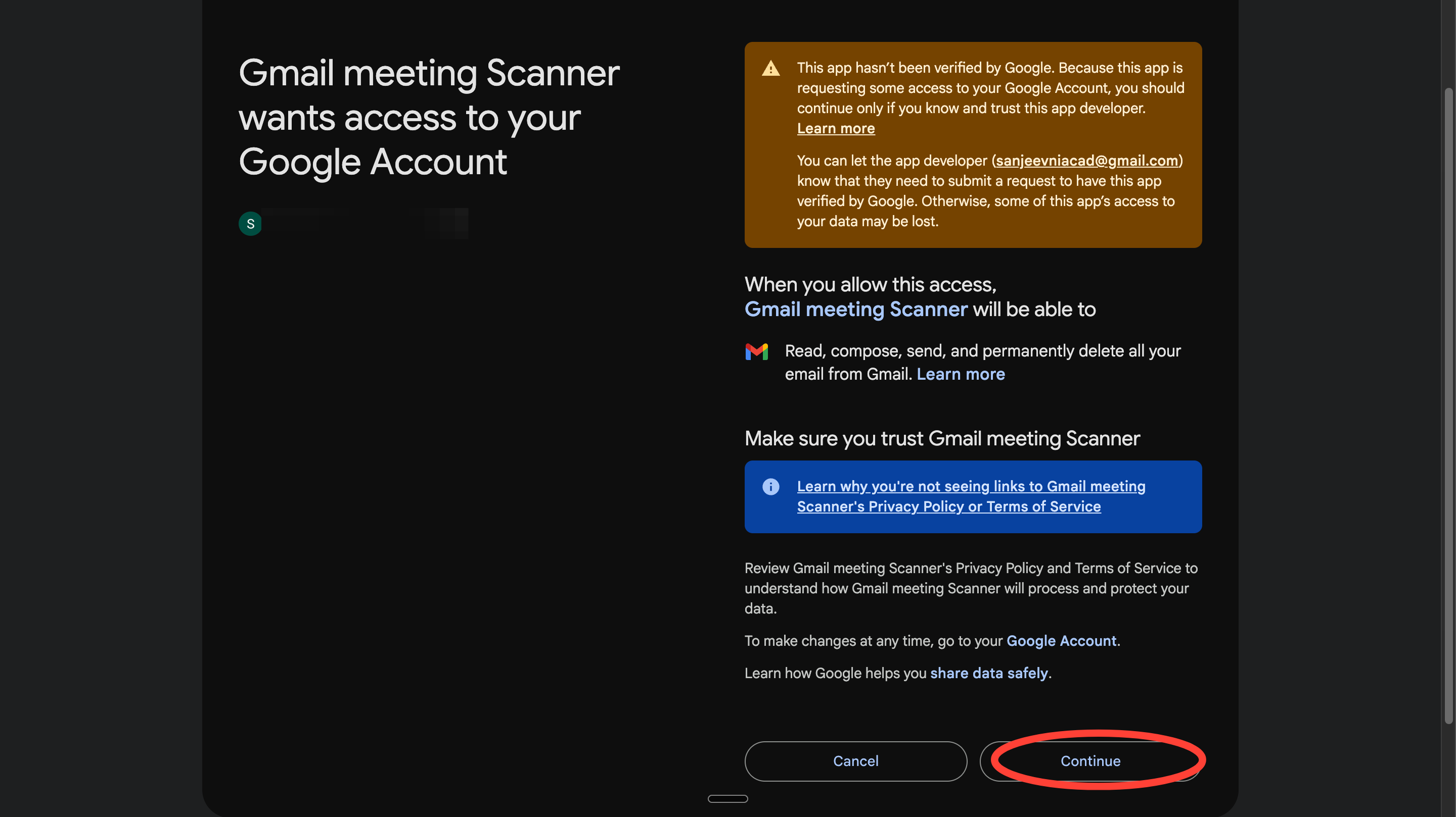 Now, you should see access permissions like this. Hit Continue.