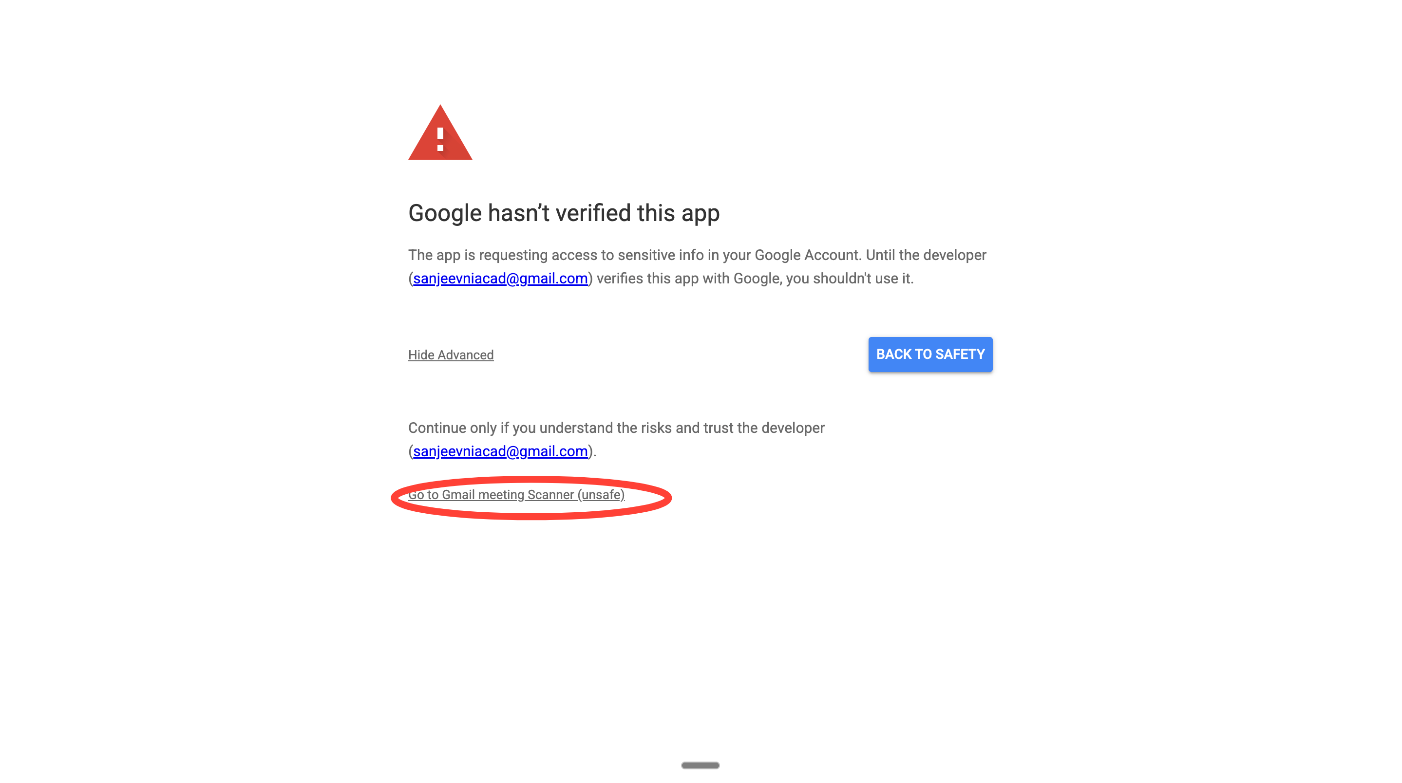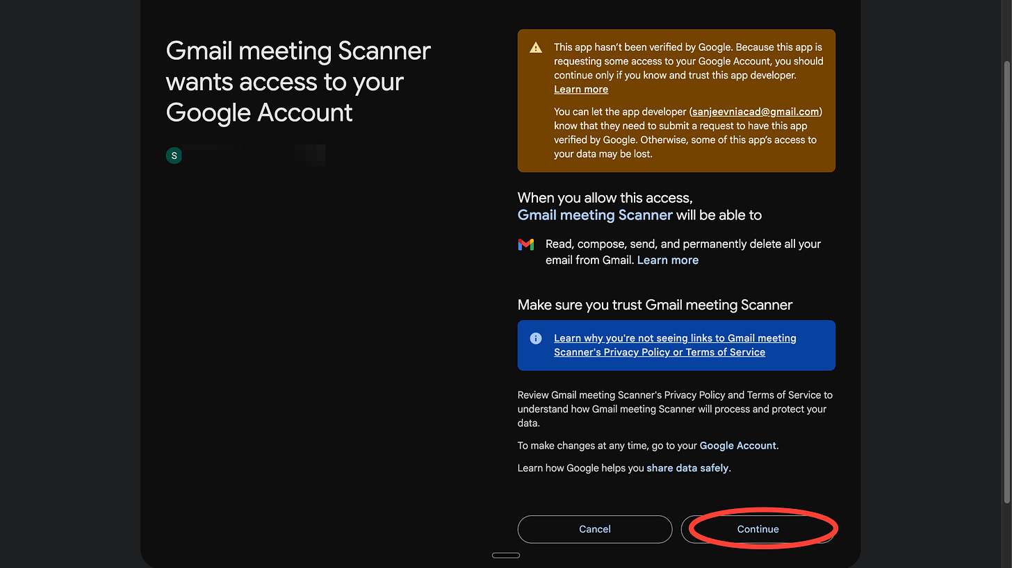 7. Now you’ll see a bunch of permissions to allow Google to run your Apps Script within Gmail. Click on the grey link here. It should show your project name.