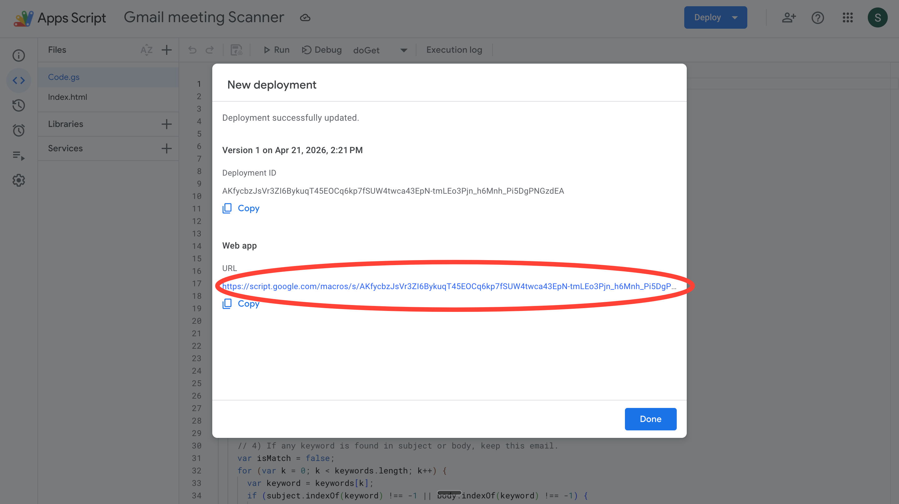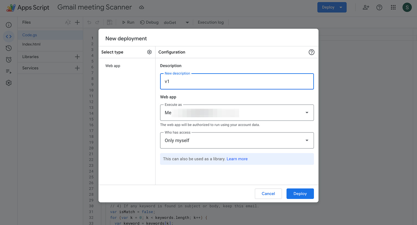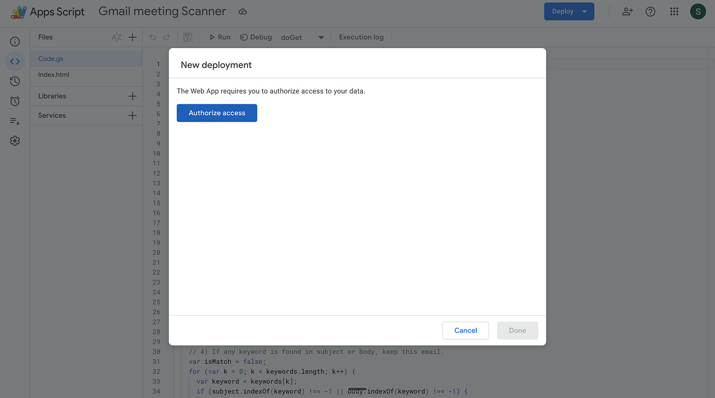 Google Apps Script will now give you a web app deployment link. This will open the HTML page displaying your meetings.