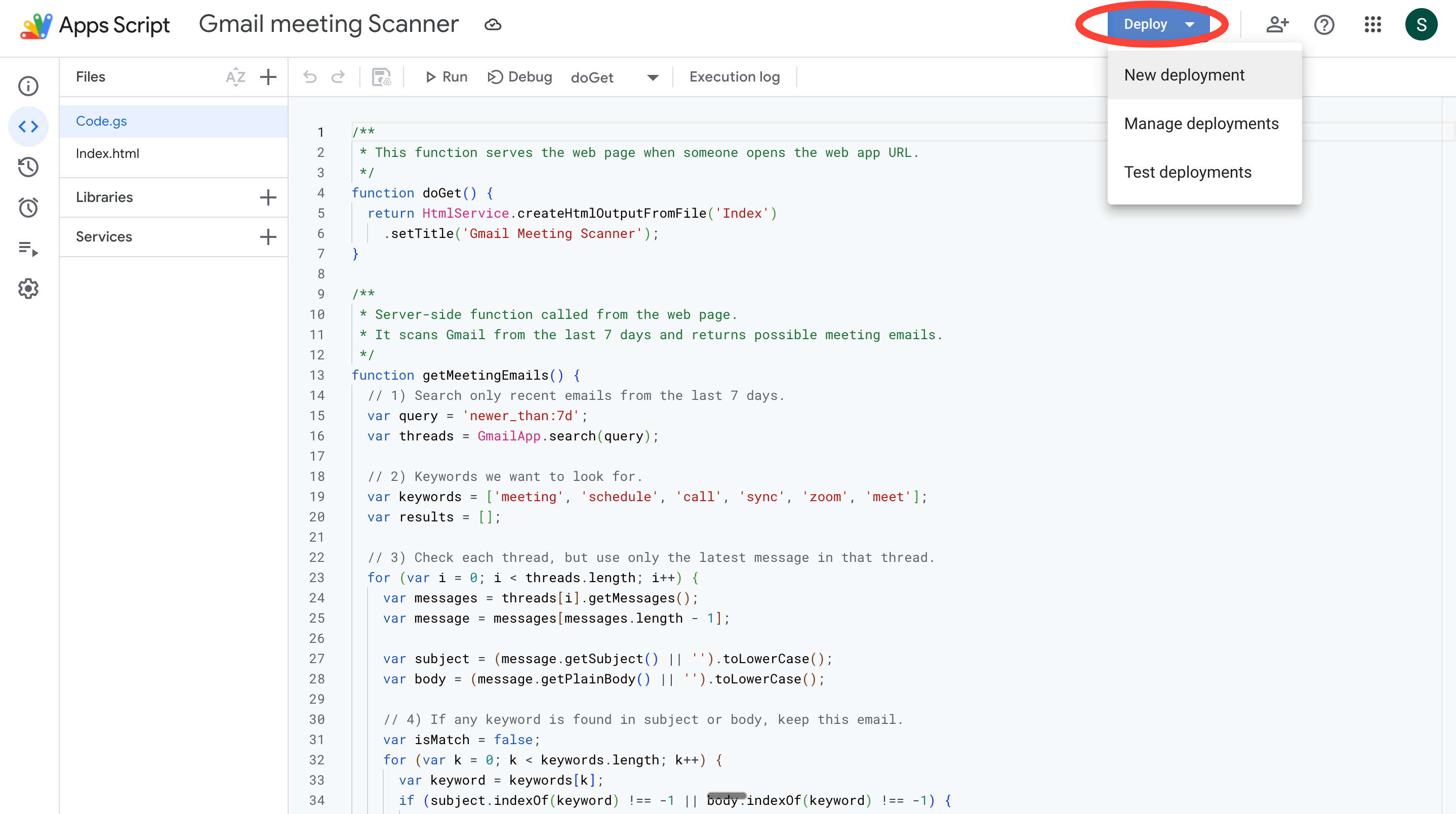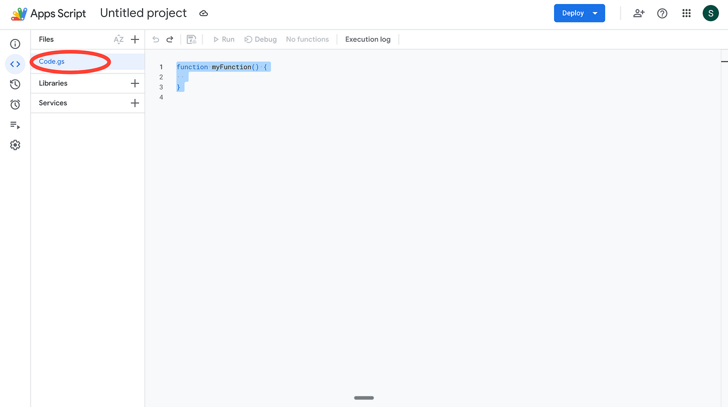 3. Now, click on New Project. You should see a Code.gs file created by default. This is where we’ll write all the code to run the app.