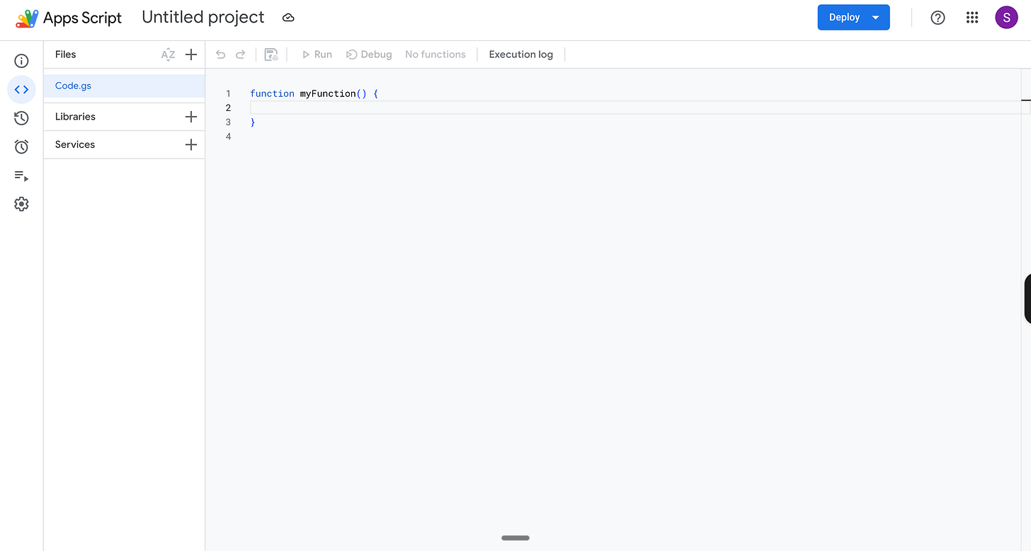 3. A new Apps Script tab will open with a blank Code.gs tab and no HTML tab. We’ll paste our code here.