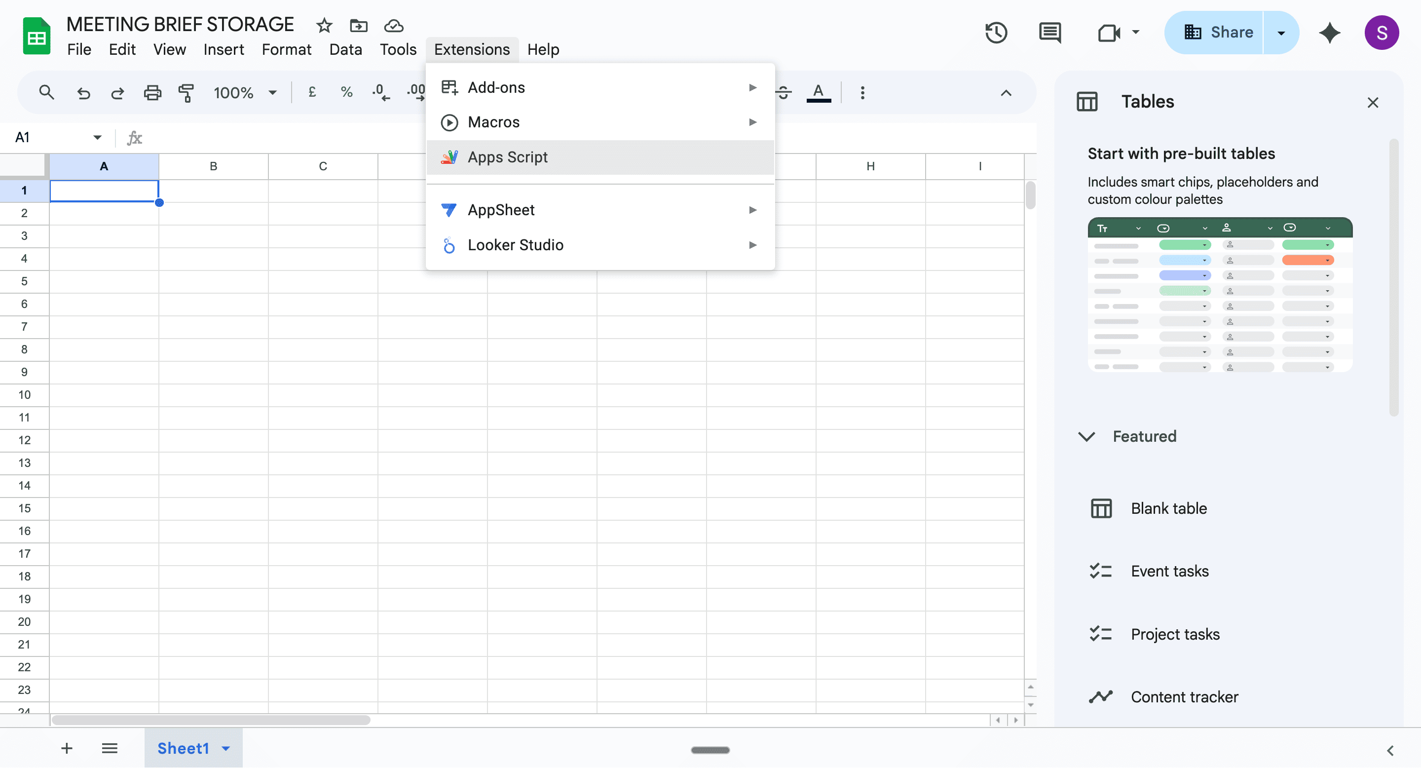 1. Go to sheets.google.com and create a new blank spreadsheet. Name it Meeting Brief Storage.