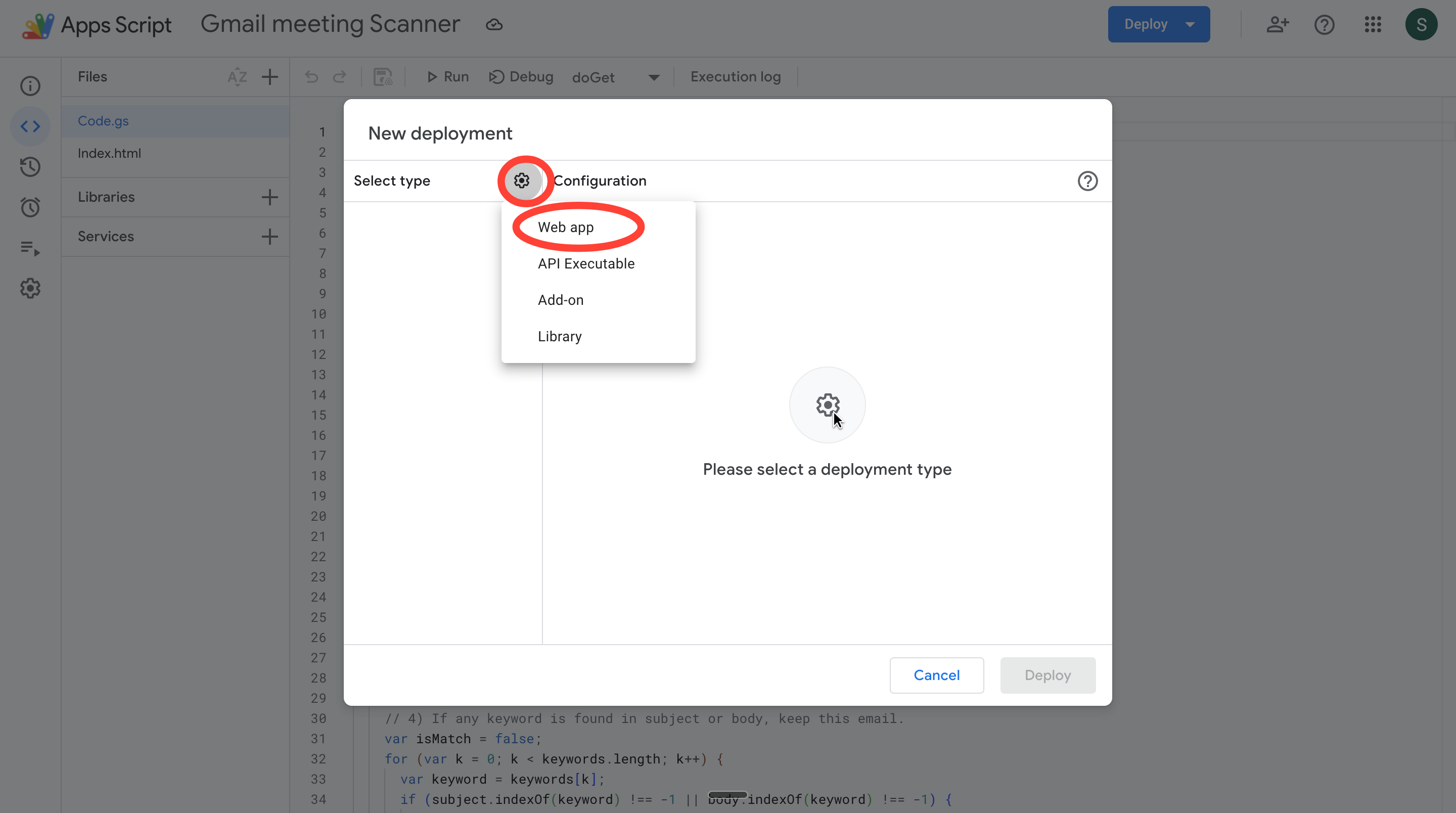 4. If nothing shows up under Select Type in the New deployment dashboard, click on the Settings icon and select Web app.