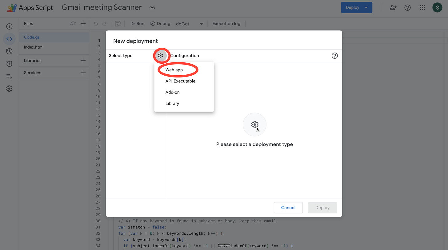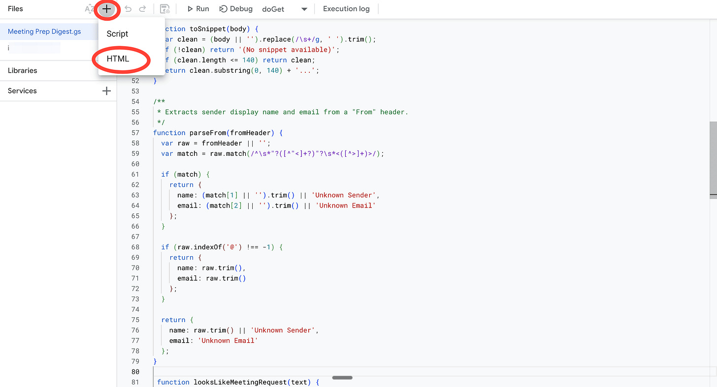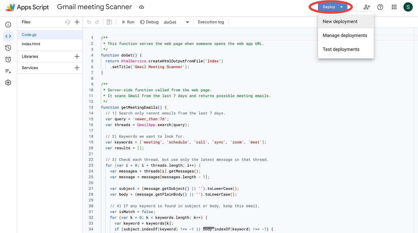 Now, Google doesn't have a nice built-in way to show that any app you make in its ecosystem is working. So we’ll build a tiny temporary webpage that displays what the script fetched — just so you can confirm it’s actually finding your meetings correctly. Think of it as a window into what your script is seeing.