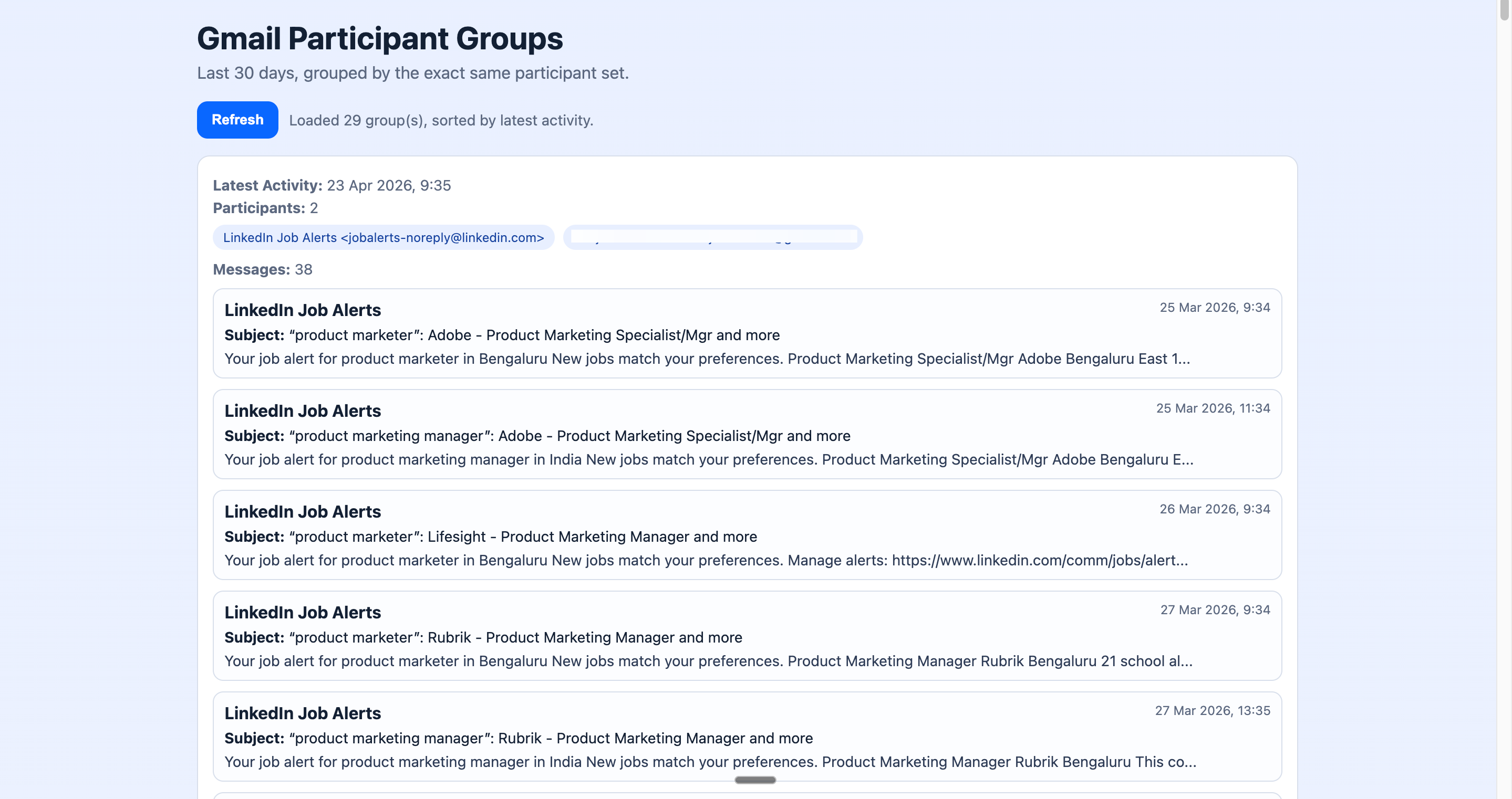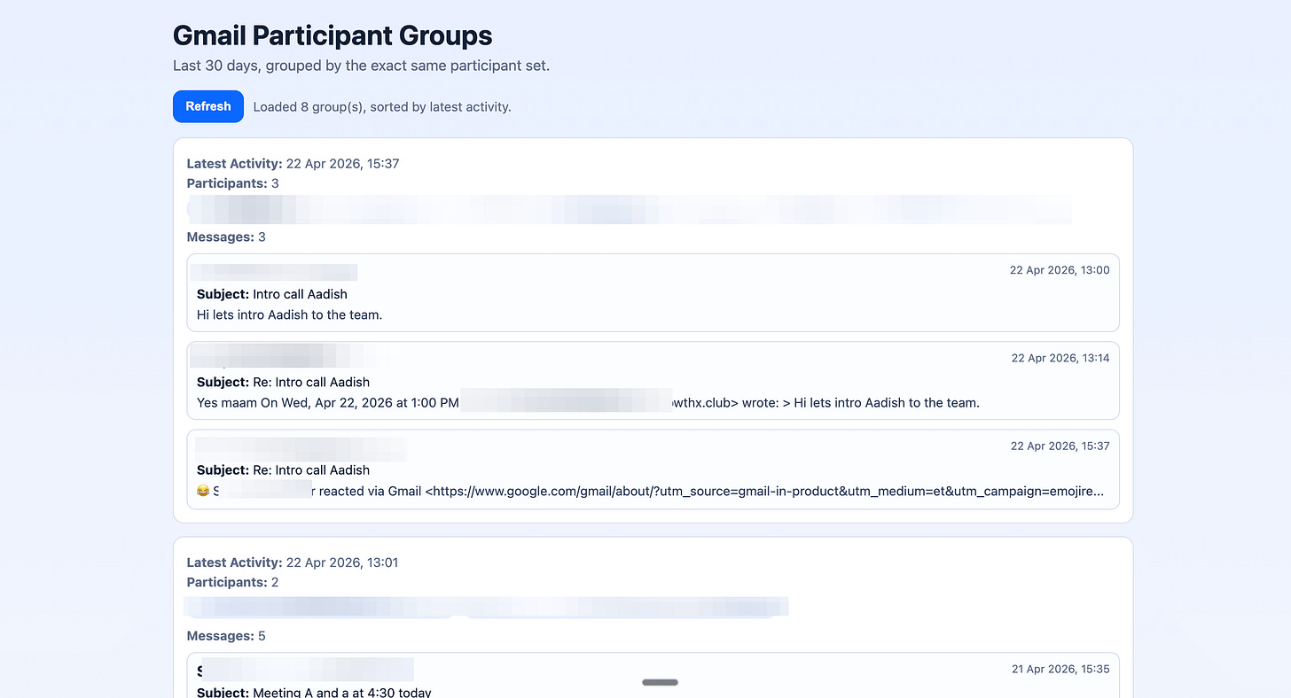 The grouping isn’t always clean. The app doesn’t know your calendar. It doesn’t know who you’re meeting today — it just groups email threads by participant and lets you generate a summary for any of them.