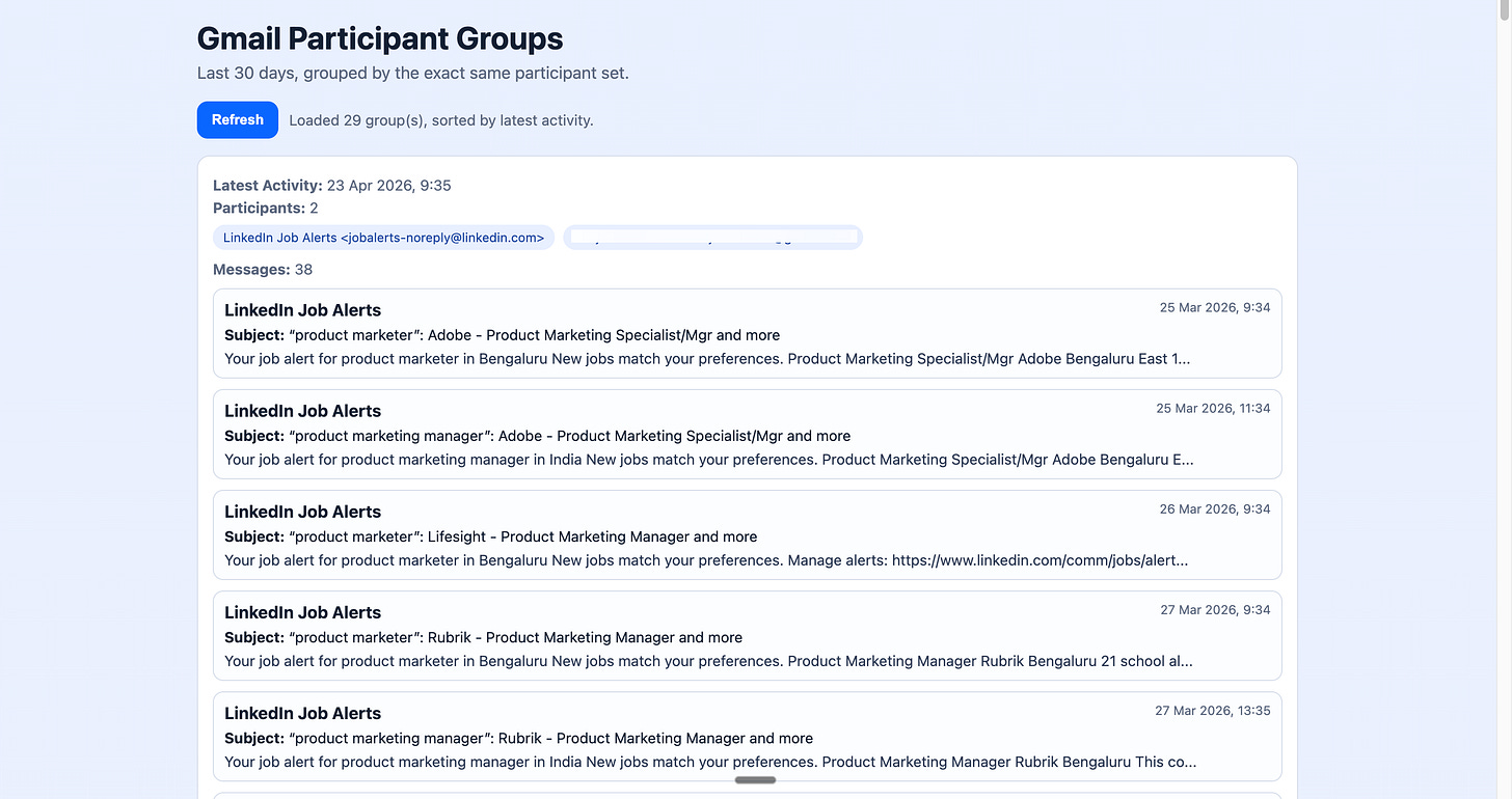 Here’s what my output looks like right now. It’s fairly messy. 29 groups and none of them meetings. Gemini will eat up too many credits just getting to the right emails. So, our next step is improving the filtering.