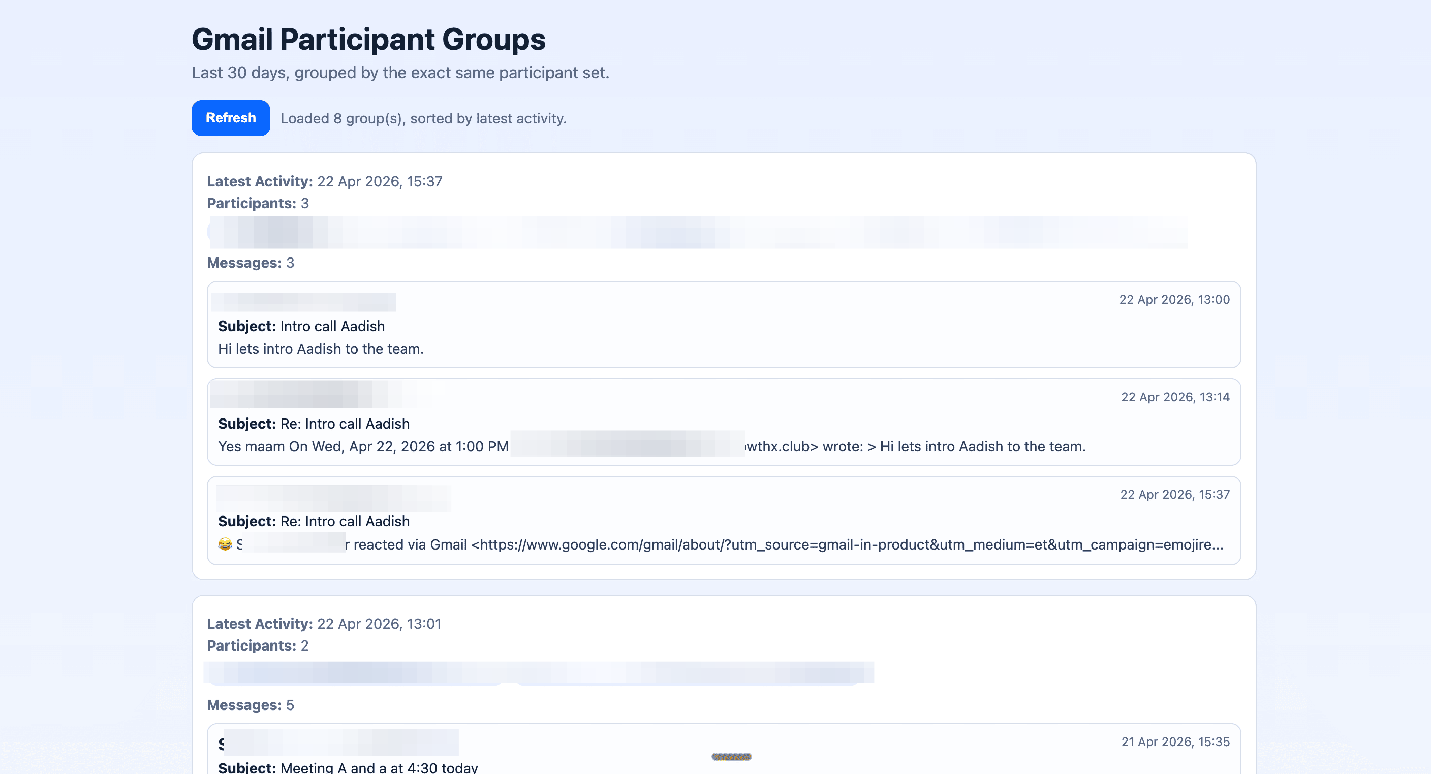 Write a single clean Google Apps Script Code.gs file from scratch. No duplicate functions. The app scans Gmail threads from the last 30 days, groups threads that involve the exact same set of people together, and returns the groups sorted by most recent activity. Each group should contain the list of participants and all messages in chronological order with sender name, date, subject and a short snippet. Don’t use older code.gs files