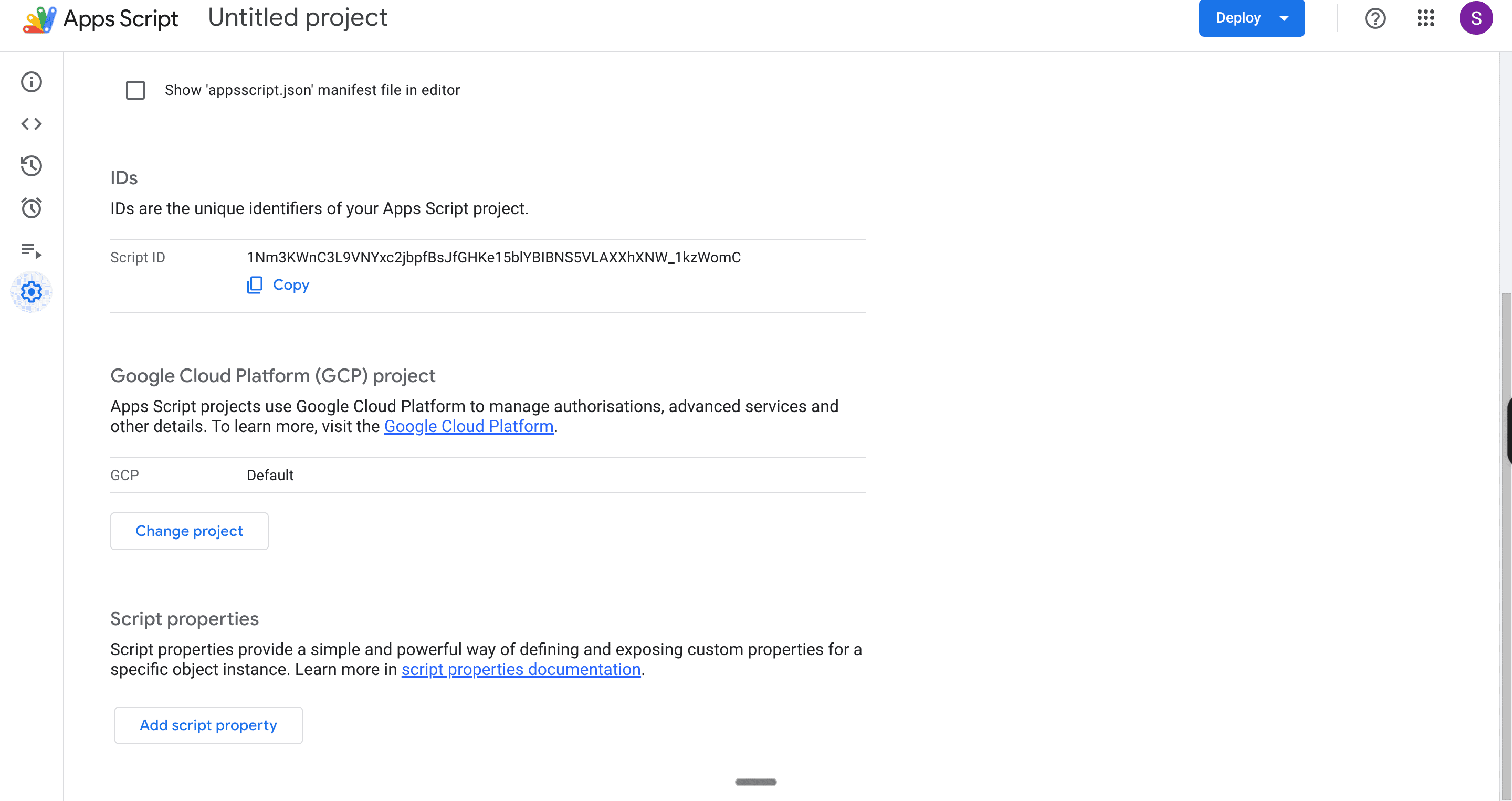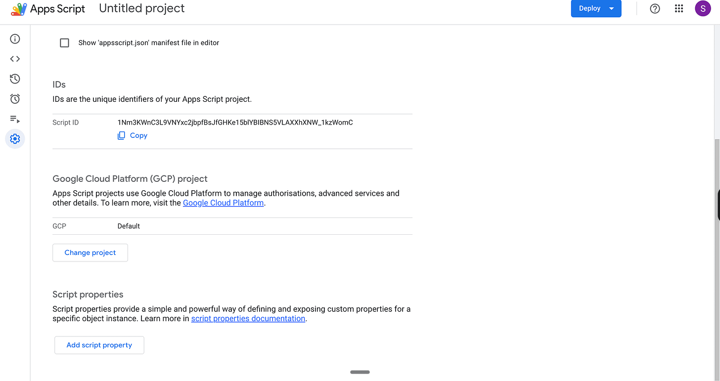 Now, go back to your Apps Script. Click the gear icon on the left sidebar to open Project Settings.