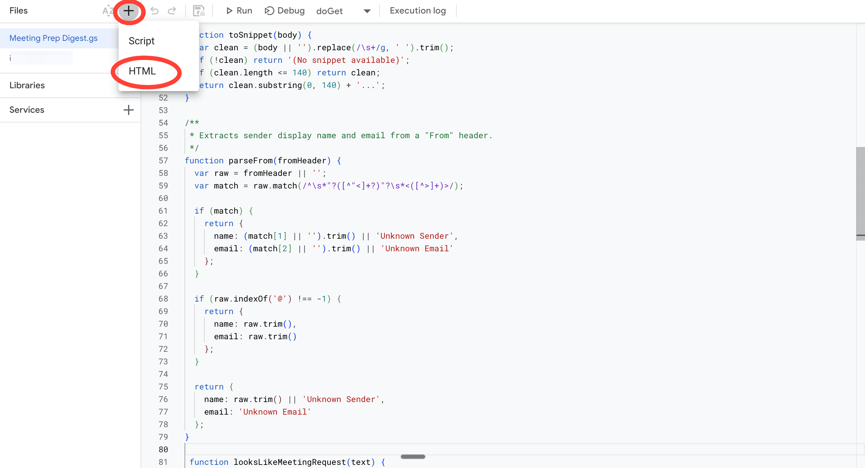 1. Go to the ‘+’ icon above your Code.gs file. Click on it and select HTML. This creates a new tab in which you can post your HTML code.