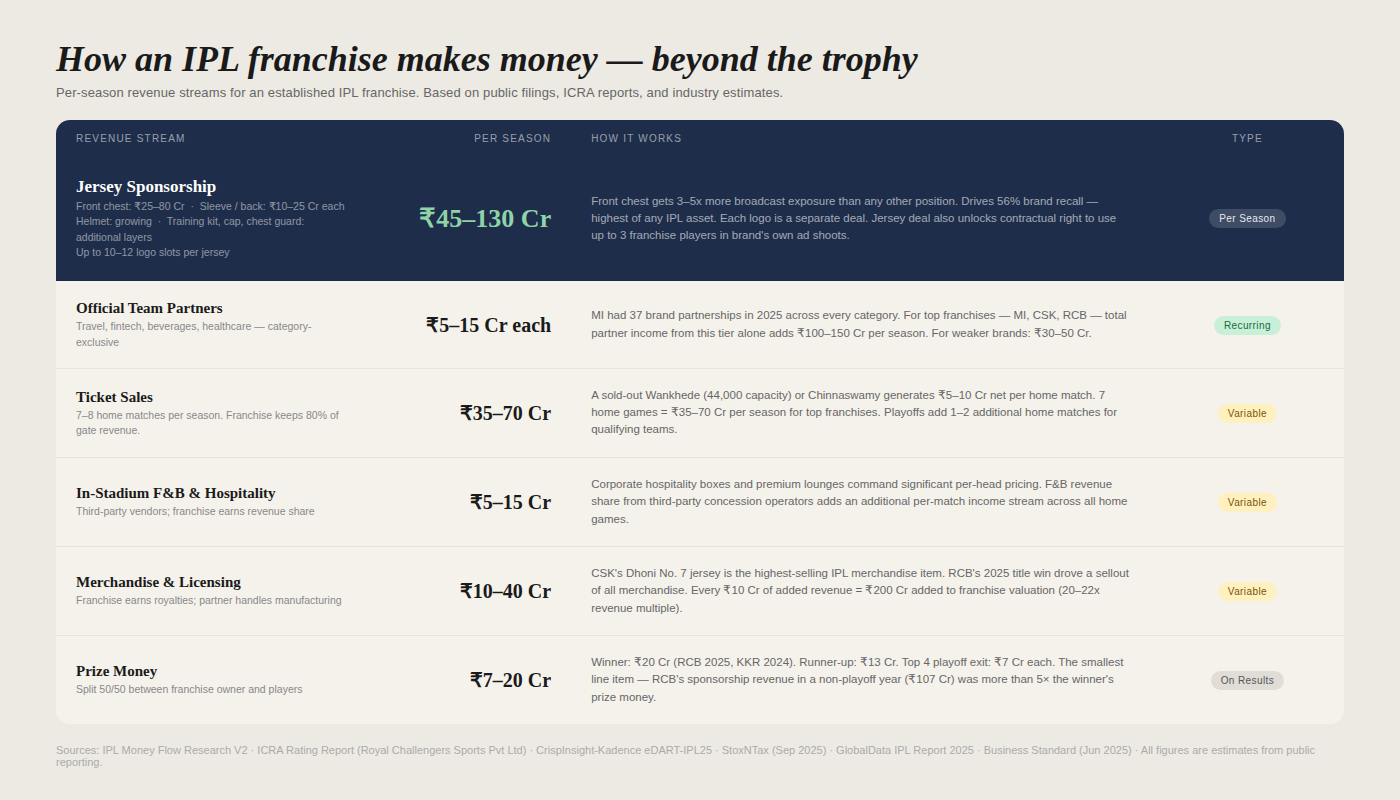 That is the full picture of how an IPL franchise makes money. Central pool. Sponsorships. Tickets. Hospitality. Merchandise. Stack it all up for RCB in FY2024, and you get ₹649 crore in revenue and ₹222 crore in profit.