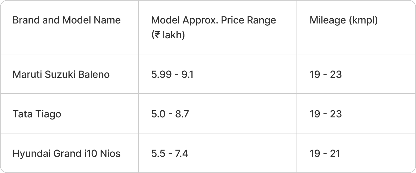 Let’s look at it in practice. If you wanted a mid-range hatchback retailing for about ₹7 lakhs, you’d have these options. Each offers comparable mileage for the price. Which would you pick?