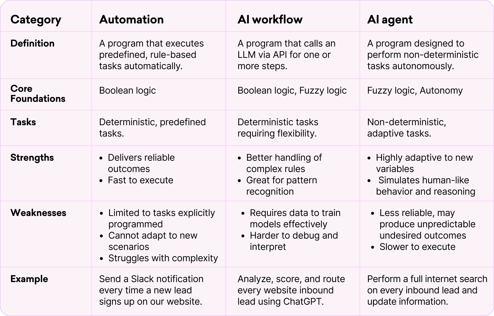 Make, a tool for building AI agents & a competitor of Zapier, defines automations vs agents vs workflows. Those two look similar, but there’s a key difference. A workflow requires rules for every step, whereas an agent only needs context to generate them.