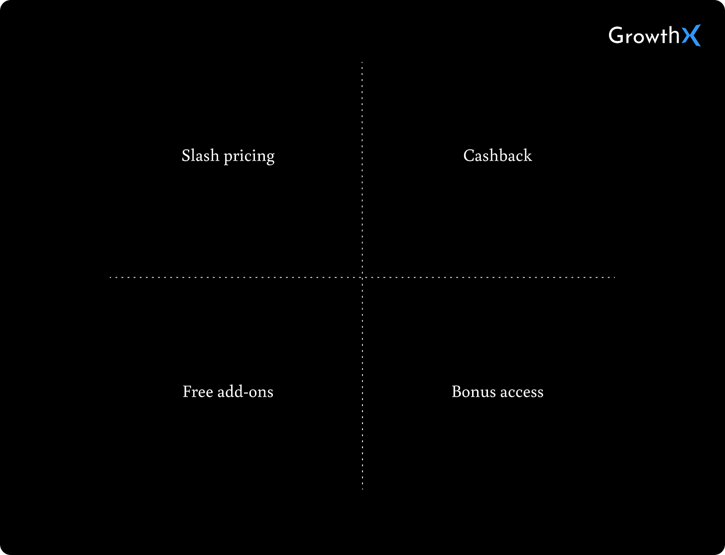 Ask your team - what are some of the key levers that will make you potential customer take action on your product? Okay, now how much time from discovering that pitch to taking action on product will that take? What would make this time insanely shorter? That’s core to finding your incentive strategy. Incentives that drive urgency could be the following.