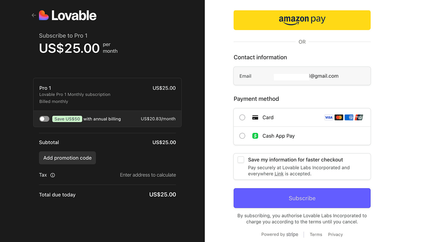3. Select the $25 plan and click on “Upgrade”. This will give you access to 100 credits for the month + usage-based cloud and AI for the project, along with a ton of other perks. You should see the payment screen next.