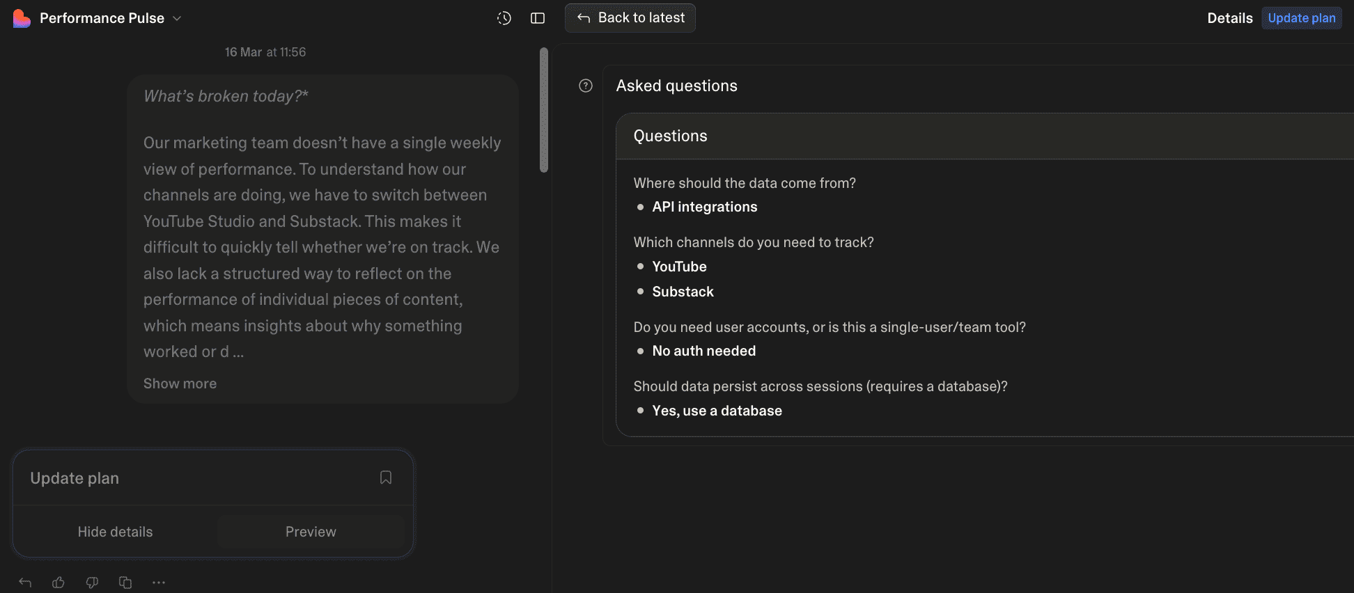 Our marketing team doesn’t have a single weekly view of performance. To understand how our channels are doing, we have to switch between YouTube Studio and Substack. This makes it difficult to quickly tell whether we’re on track. We also lack a structured way to reflect on the performance of individual pieces of content, which means insights about why something worked or didn’t often get lost.**Who feels this pain?**