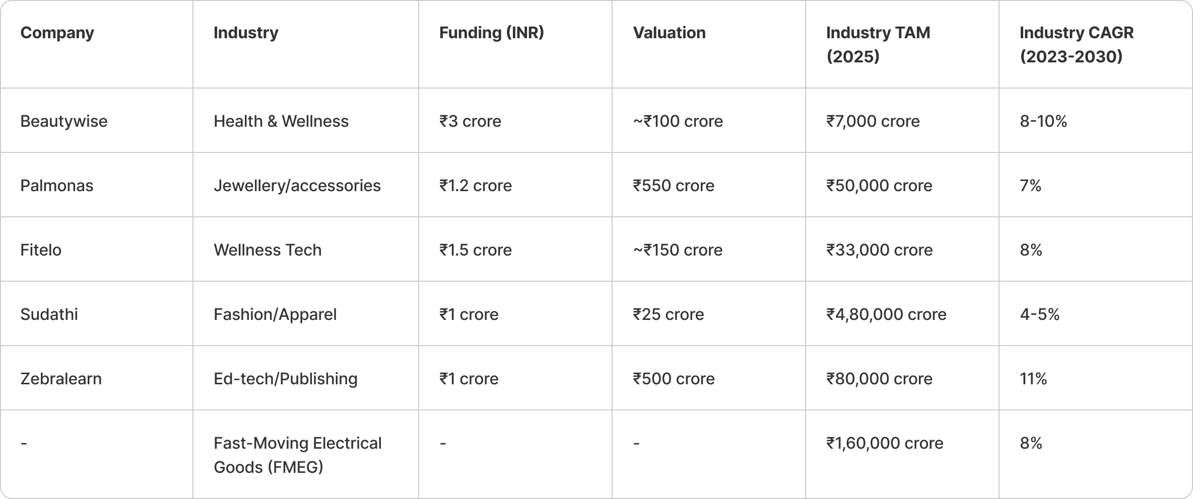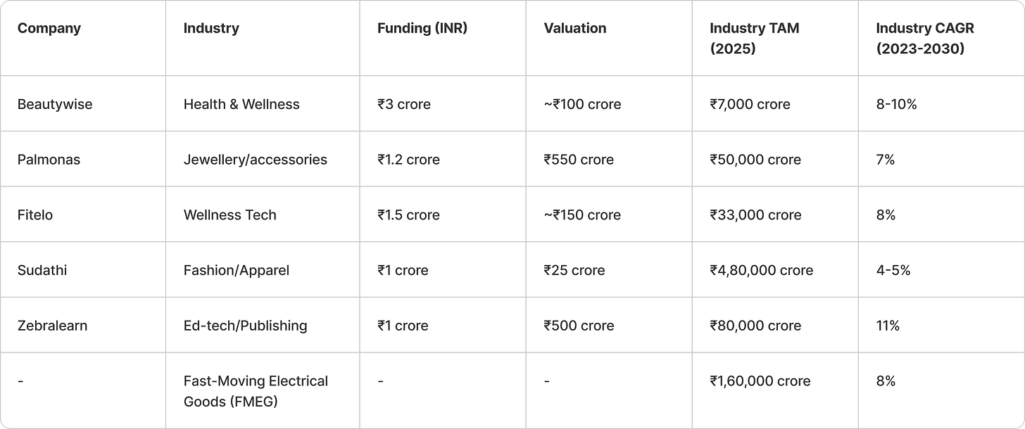 Let’s look at a list of Shark Tank India 2025’s highest-funded companies. We’ll use this as a benchmark for popular industries to start a business in. Compare their total addressable market & industry growth rate (CAGR) with fast-moving electric goods (FMEG) giants like Orient, Havells, and Crompton.
