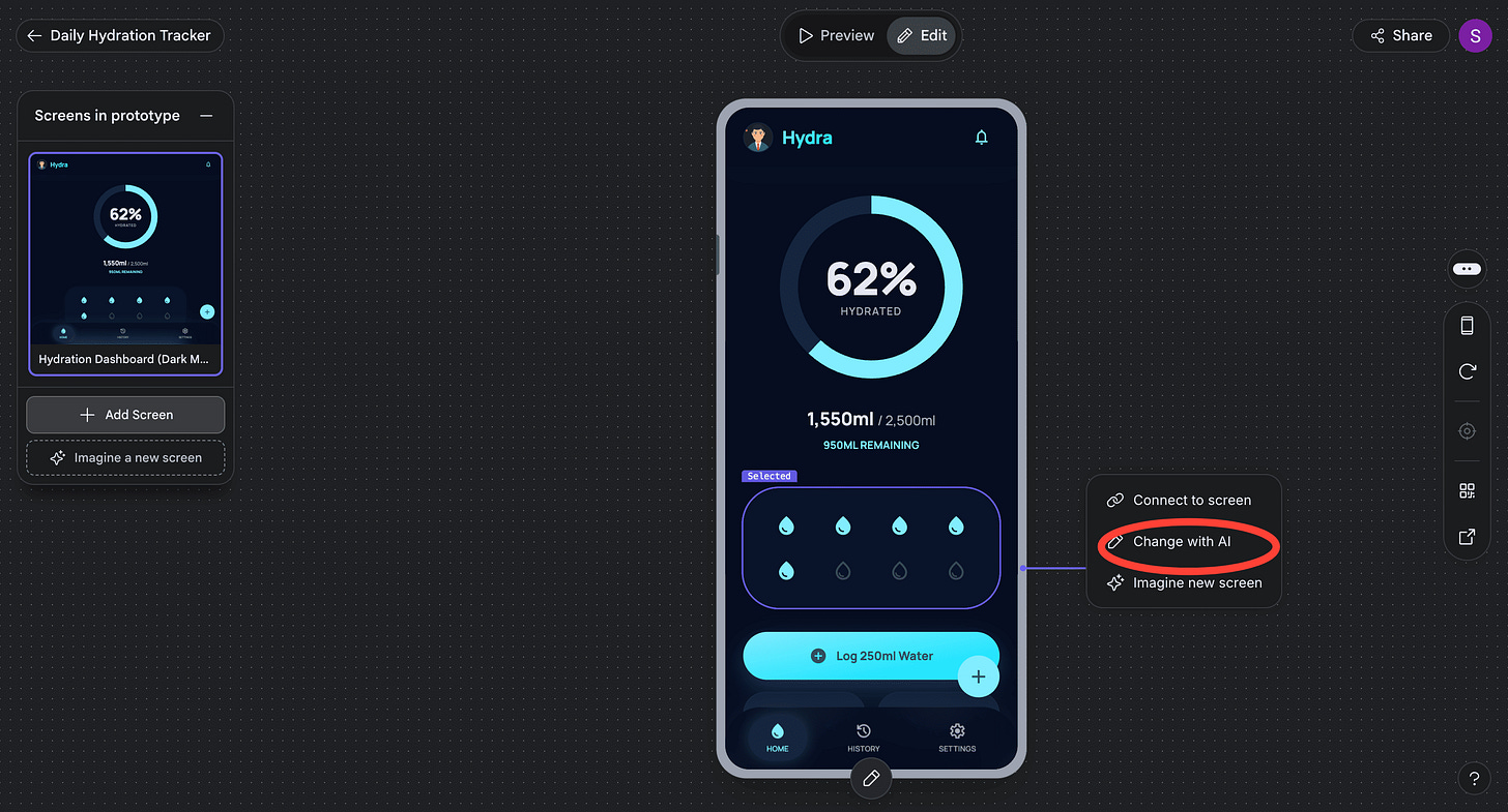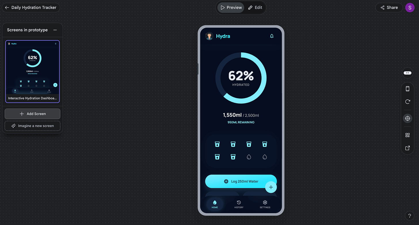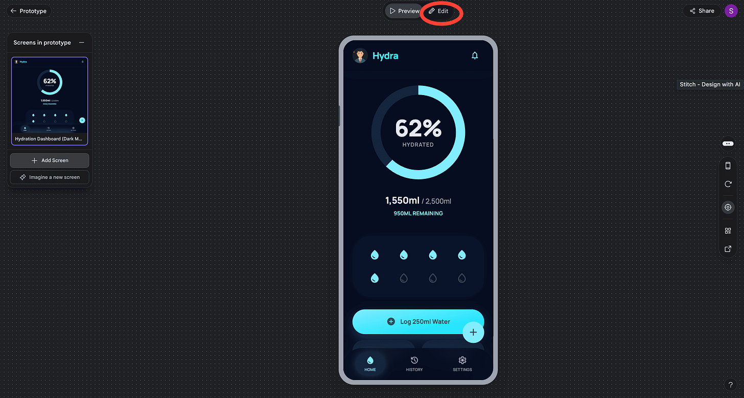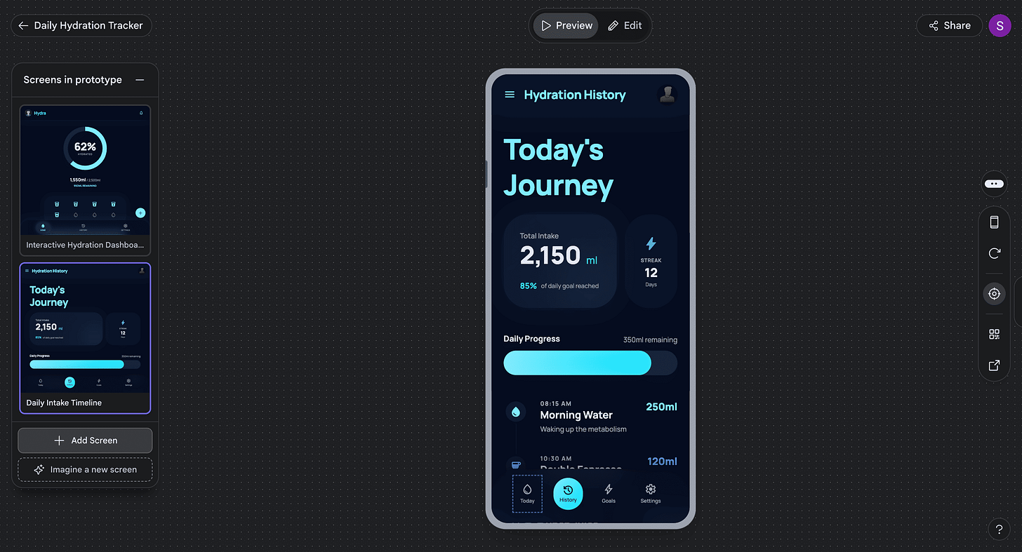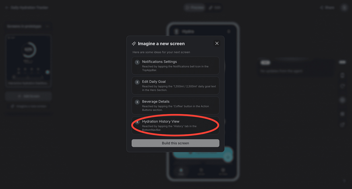 On the left, you’ll see a Screens in prototype tab. Click on Imagine a new screen. Stitch automatically suggests options for creating screens based on the available elements on your screen. We’ll select the Hydration History View tab.