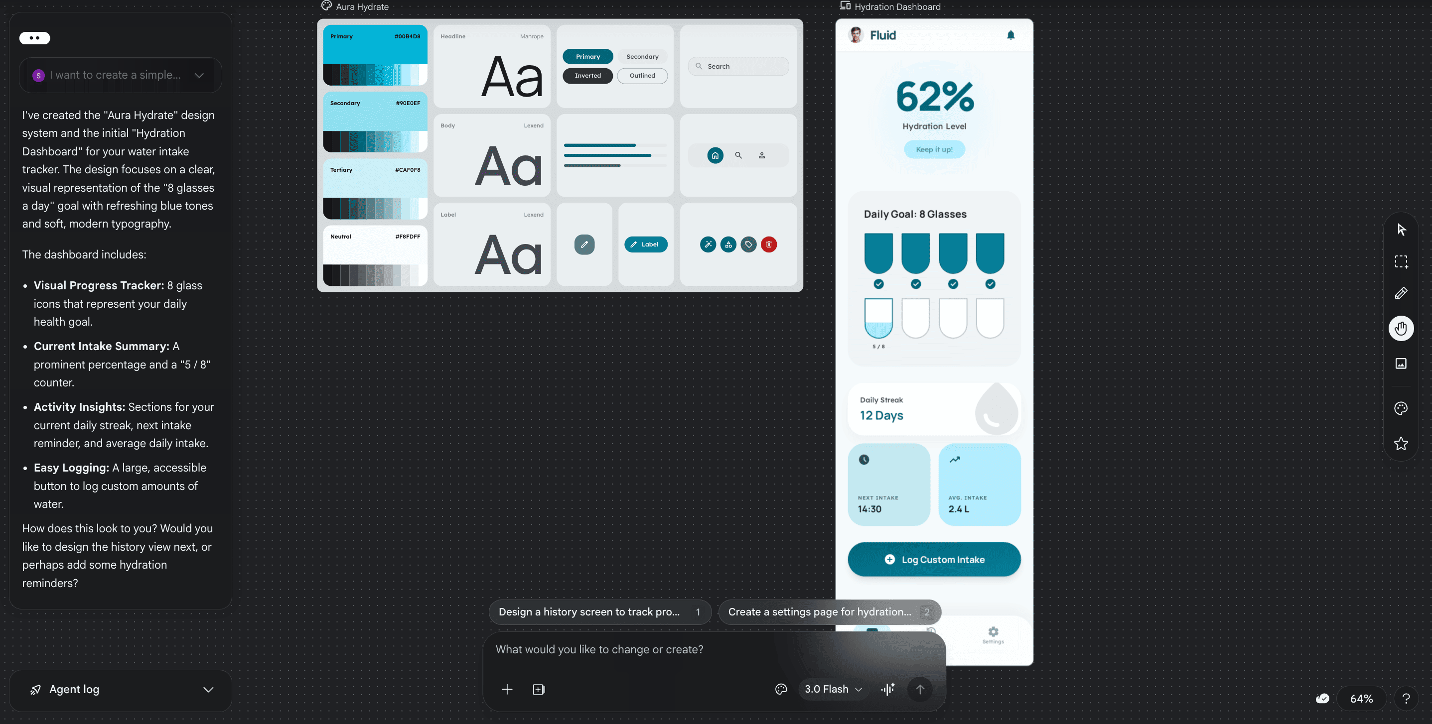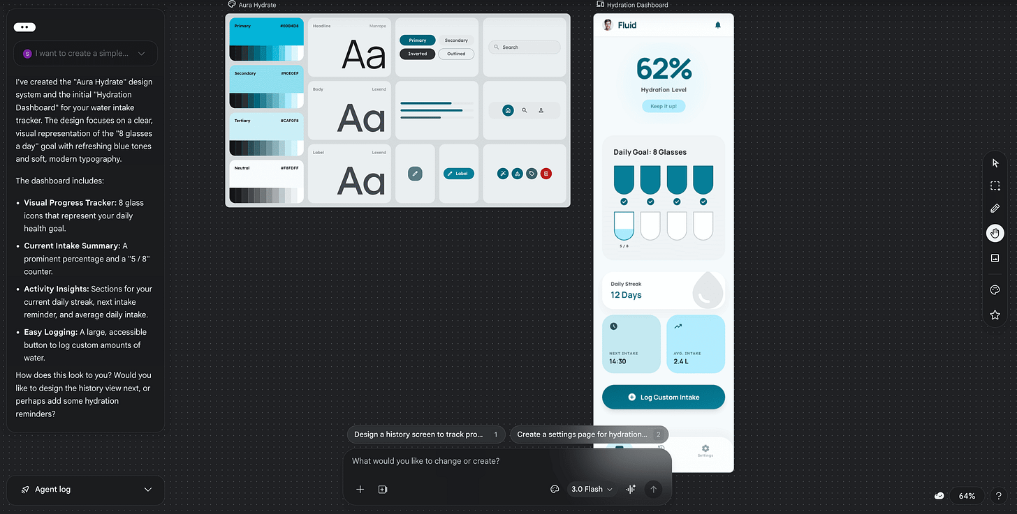 2. You’ll see Stitch use Gemini 3.0 Flash to create an entire project plan. Eventually, Stitch will generate a visual design system, including the fonts, colours, and iconography it will use to create your hydration tracker.