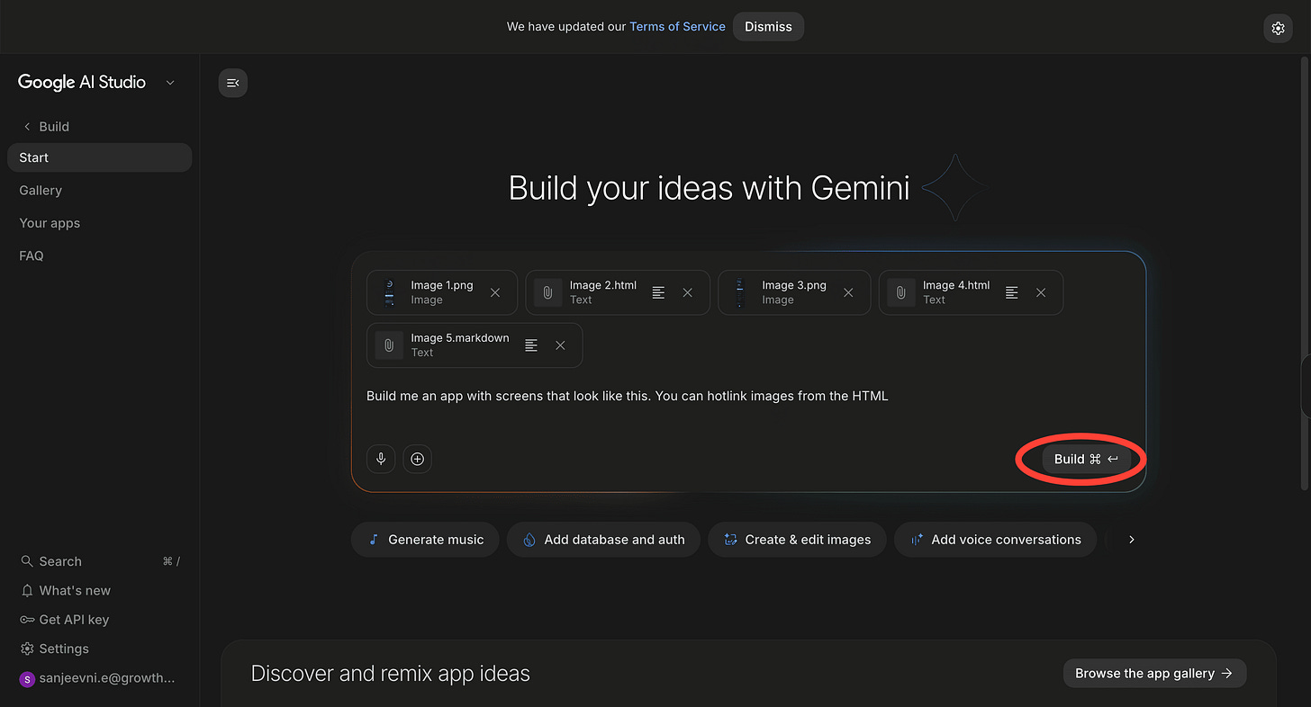 Google AI Studio opens up with your prototype images. The tool will now build the app using these screens once you click Build.