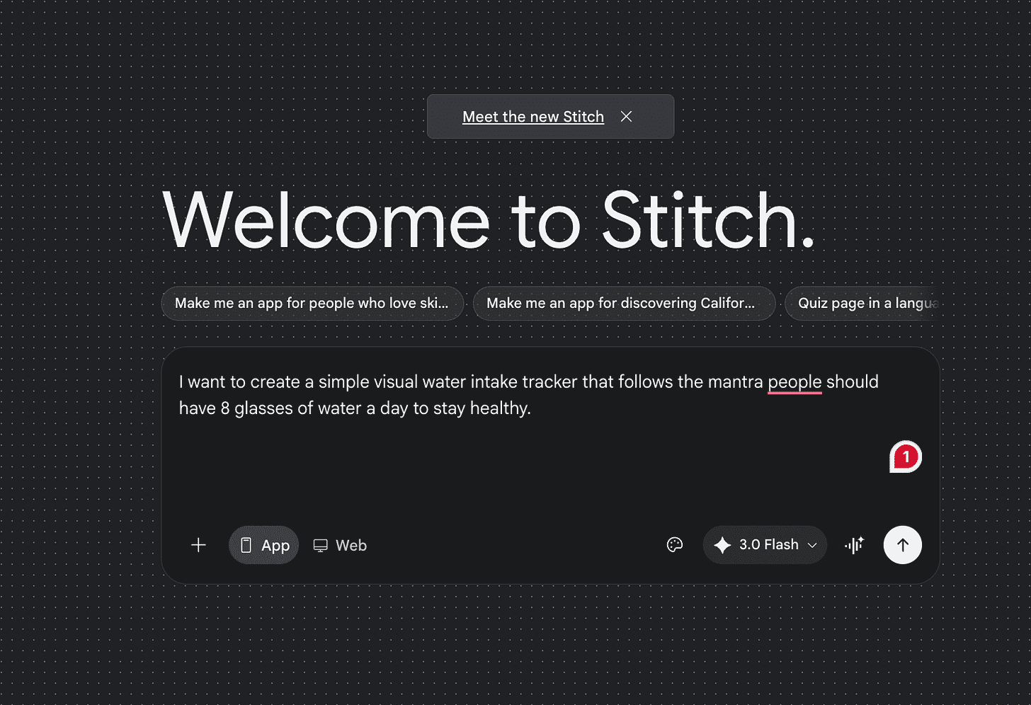 We’re building a simple hydration tracker using Stitch. The goal? Get the user to drink at least 8 glasses of water/fluids a day.