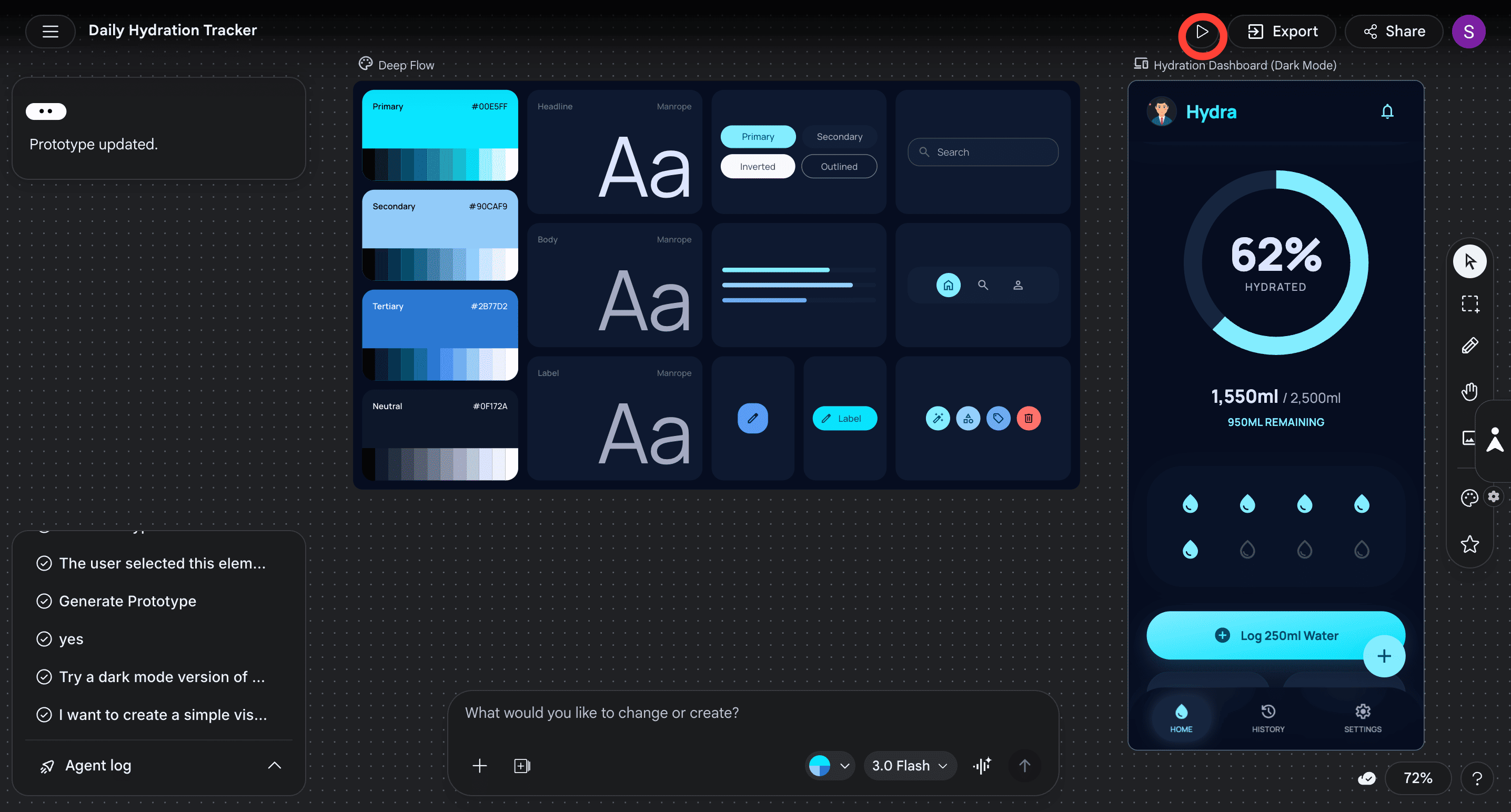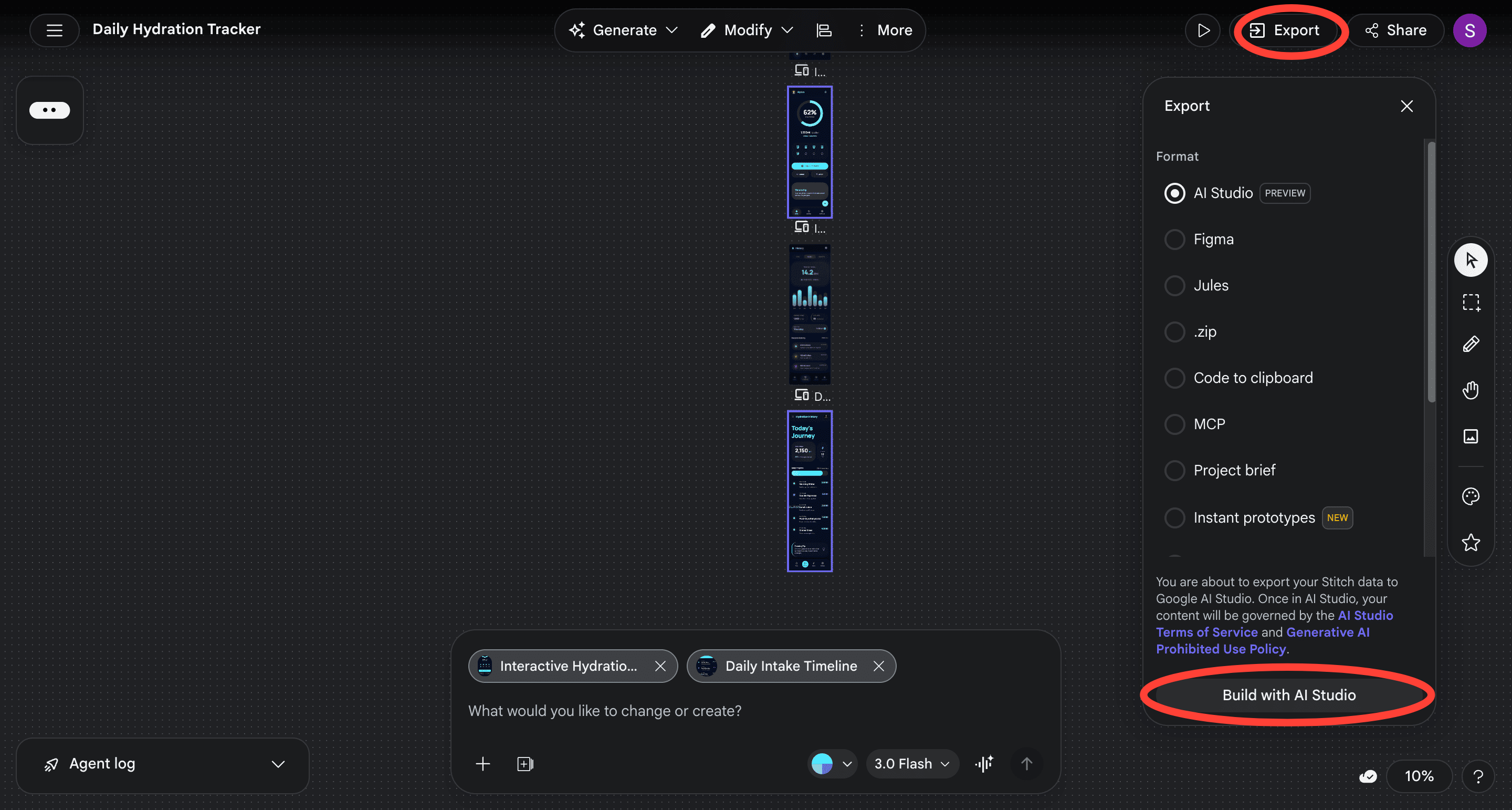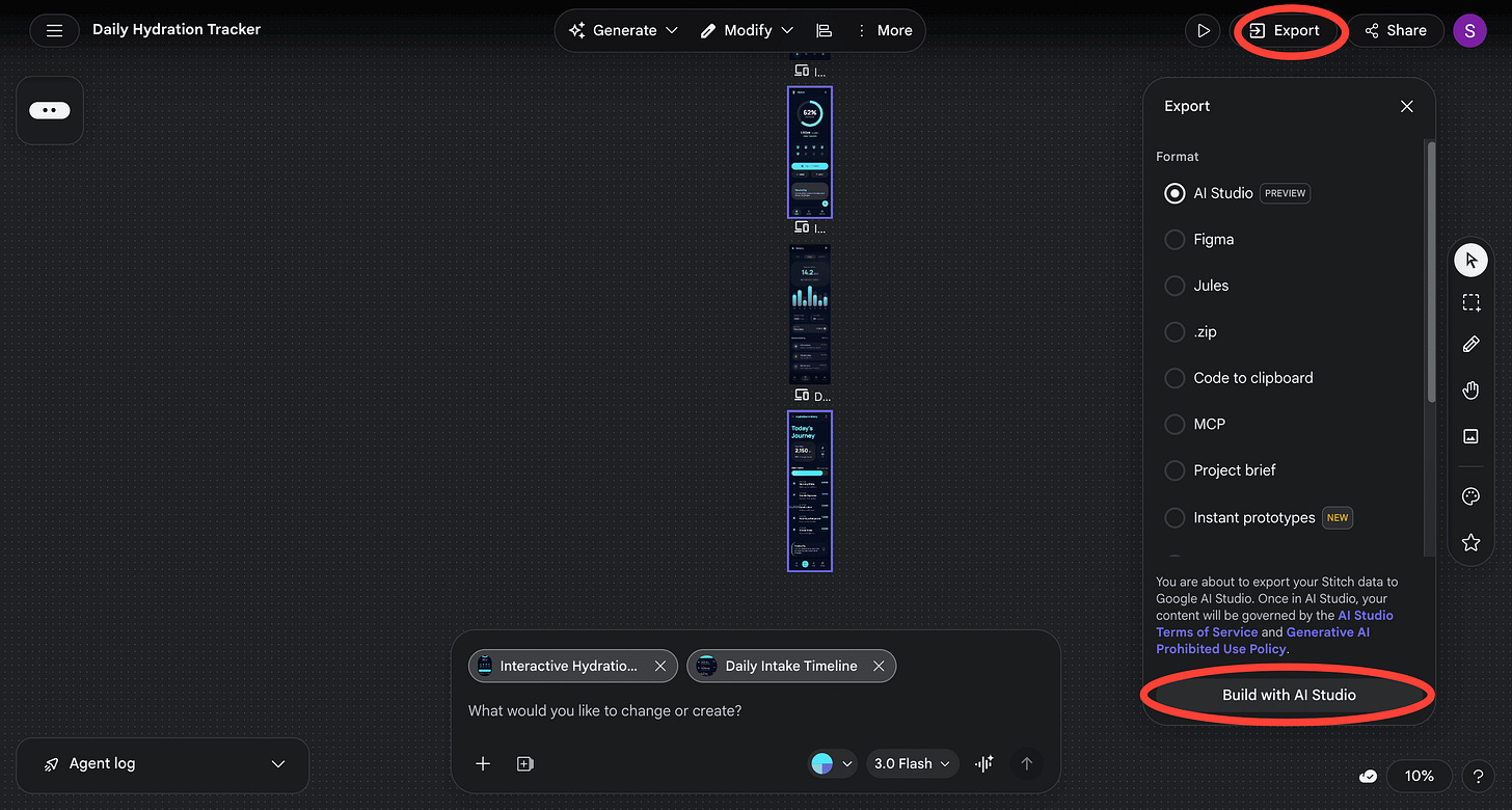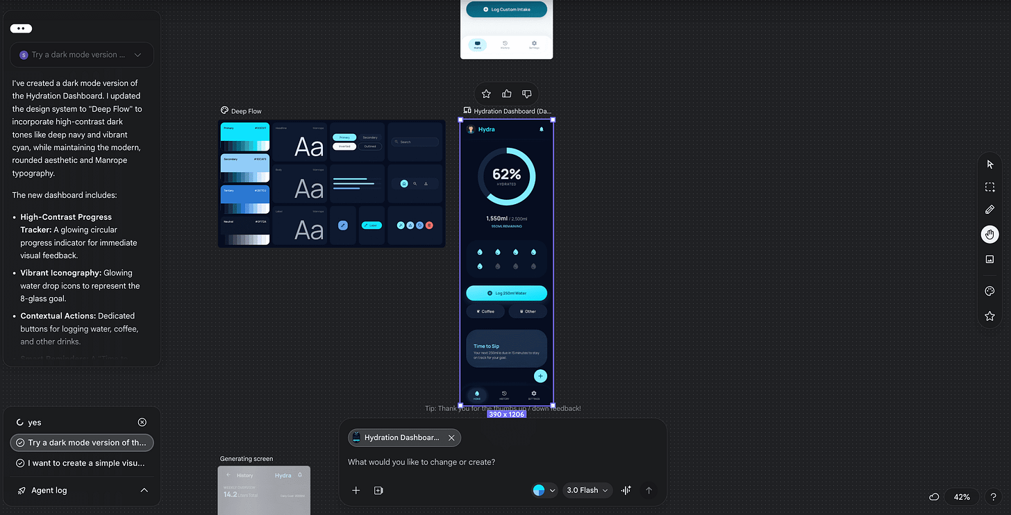 3. At this stage, give Stitch a broad idea of what you want. For this app, I requested dark mode, a circular progress tracker, and water-logging icons shaped like small droplets. My prompt:Try a dark mode version of the same app. Make the progress tracker circular. And make the water log icons shaped like droplets.