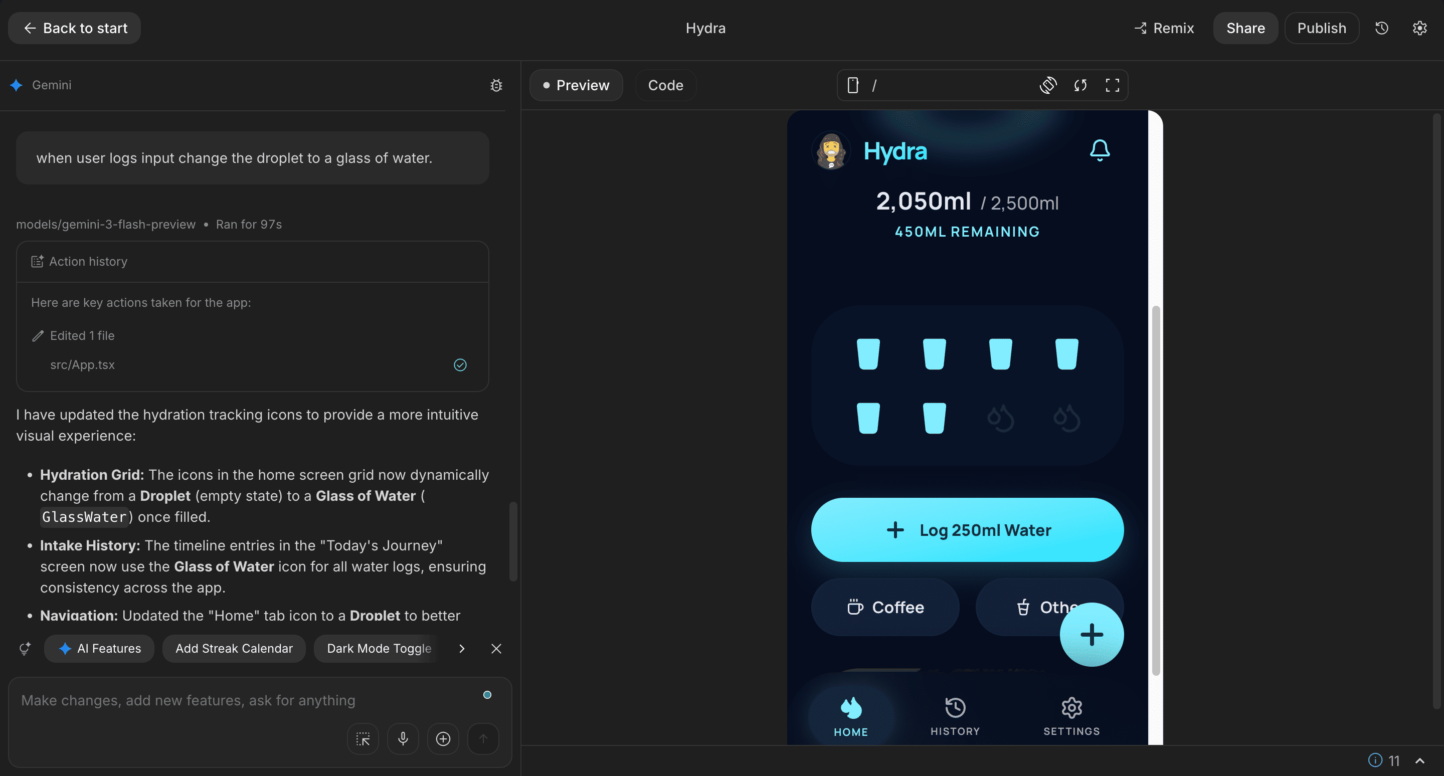 Once AI Studio builds out the app, you can make small changes to it, including interactions, back-end flows, and more, with simple prompts.