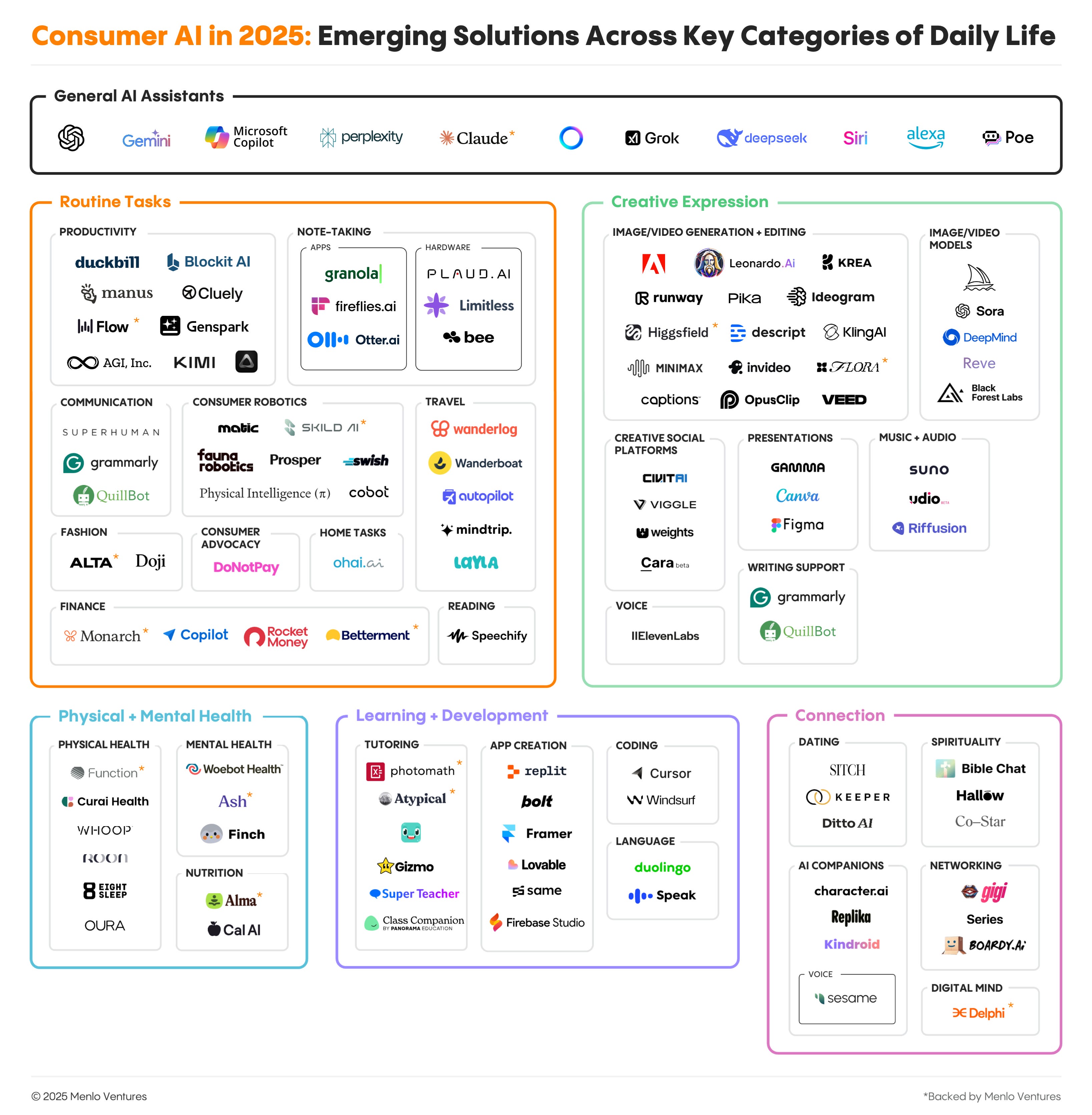 What’s getting disrupted? We’re seeing consumer AI usage across 5 key categories: routine tasks (productivity, communication, finance, note-taking), creative expression (image, video, music), physical and mental health, learning (tutoring, coding, language), and connection (dating, AI companions, spirituality). Among these, self-care companions and AI-powered email and scheduling tools are likely to see the next wave of innovation.